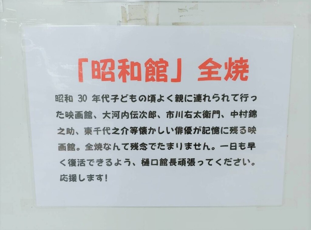 「昭和30年代 子どもの頃よく親に連れられて行った映画館(中略)全焼なんて残念でたまりません」というカクシン店主からの応援メッセージが胸に響きます。