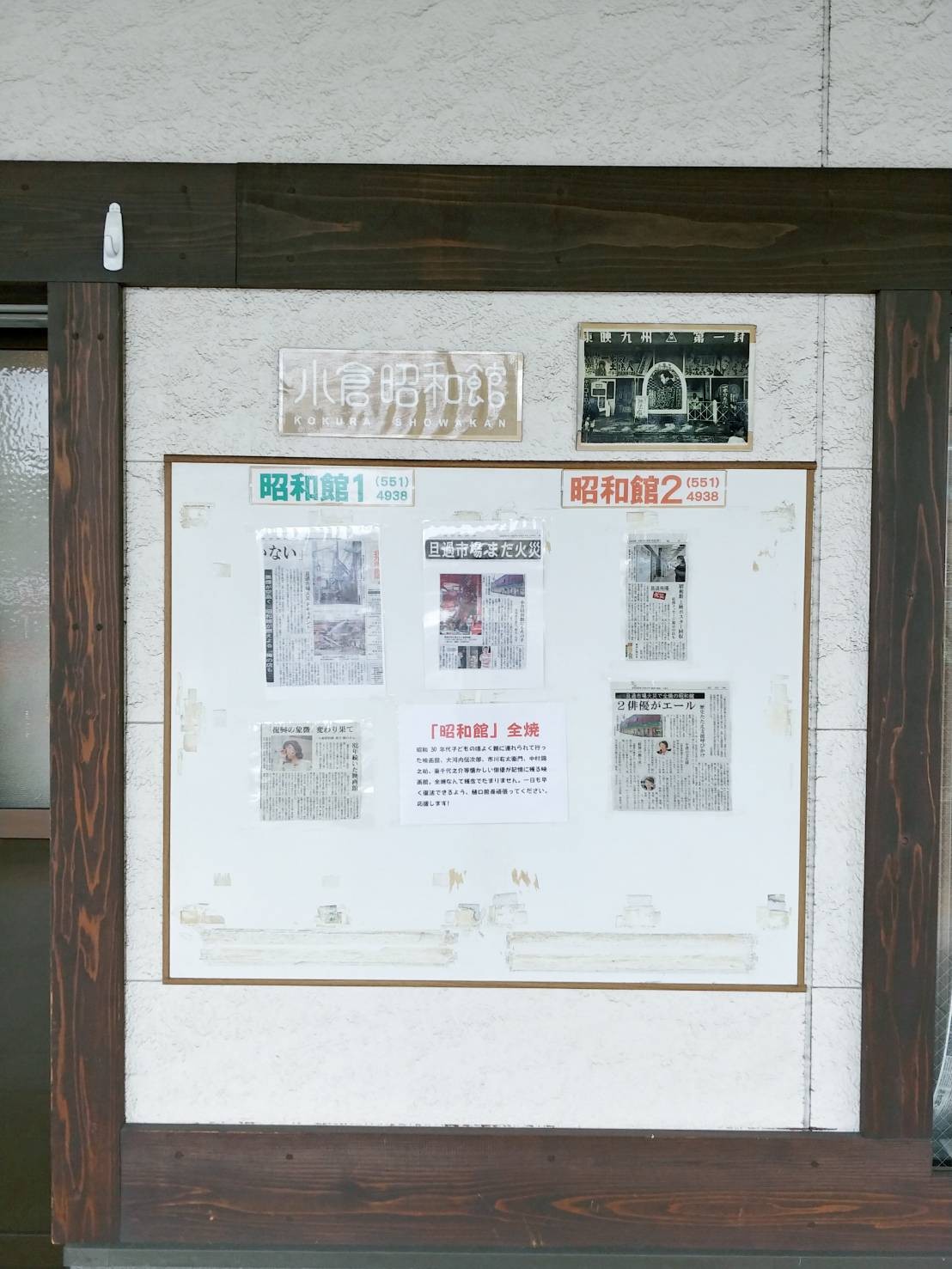 京町銀天街の中にある履物店「カクシン」の外にある小倉昭和館のPRコーナーには、火災後の同館に関する新聞記事の切り抜きと一緒に、応援メッセージが貼ってありました。