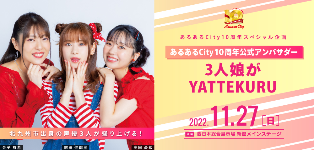 あるあるCity10周年スペシャル企画として、「あるあるCity10周年公式アンバサダー」を務める金子有希さん、前田佳織里さん、高田憂希さんの北九州市出身の”声優3人娘”がスペシャルトークを開催します。