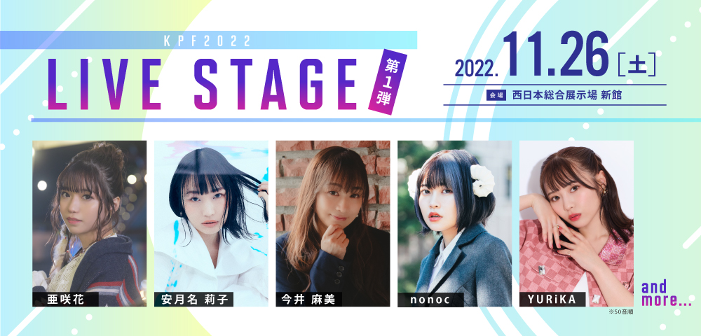 11月26日、西日本総合展示場・新館メインステージの「LIVE STAGE」の第1弾出演者として発表されたのは、亜咲花さん、安月名莉子さん、今井麻美さん、nonocさん、YURiKAさんの5人。