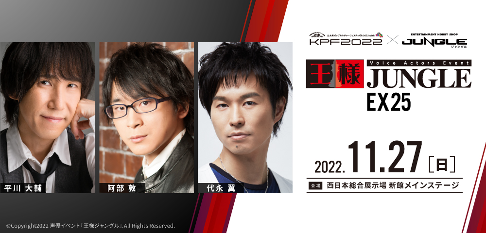 「王様ジャングル EX25」は11月27日、西日本総合展示場・新館メインステージが会場です。出演者は、平川大輔さん、阿部敦さん、代永翼さんの3名。