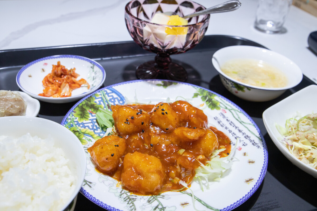 取材時は日替わりランチではなく、「エビチリ定食」を注文。メインのエビチリに、サラダ、中華スープ、点心、漬物、デザートがセットになっています。全体的にやさしめの味付けで、辛いのが苦手だったり、八角や山椒などの香辛料が苦手だったりする人も安心して食べることができるような味わいでした。