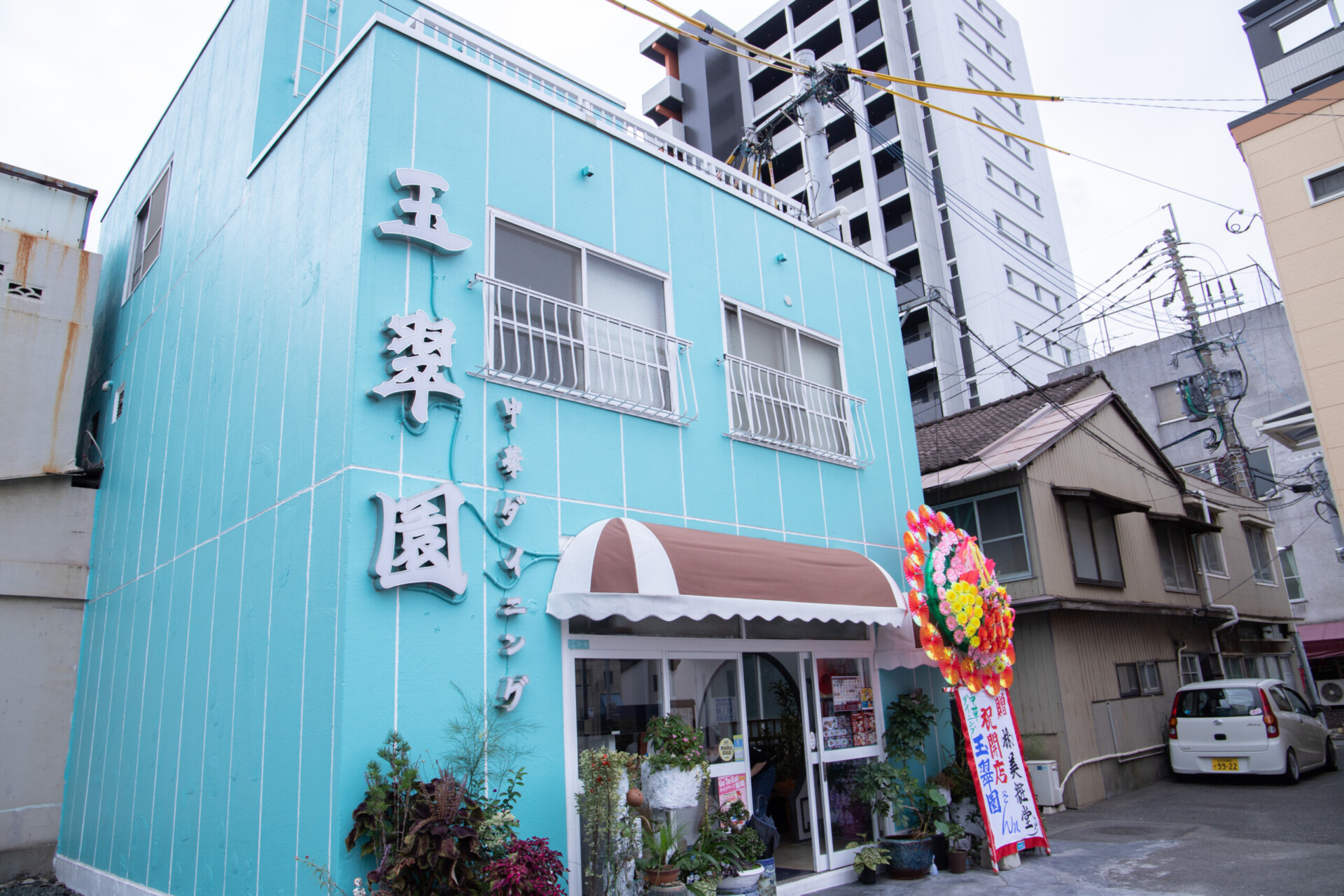 2021年10月にオープンした中華ダイニング「玉翠園(ぎょすいえん)」。鮮やかなターコイズブルーの建物の1階部分がレストランになっています。