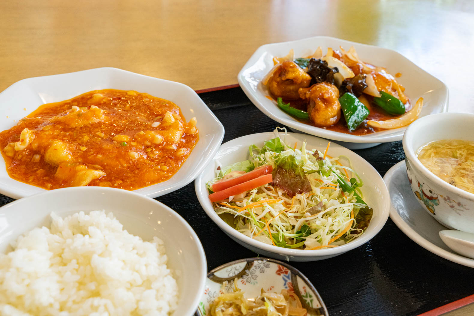 取材日はもちろん「週替わりランチ」を注文し、メインはイカのチリソースと酢豚を選択。中華独特の風味の香辛料は控えめで、脂っこくもない老若男女に好まれるマイルドな味わいなのも長年愛される理由なのでしょう。