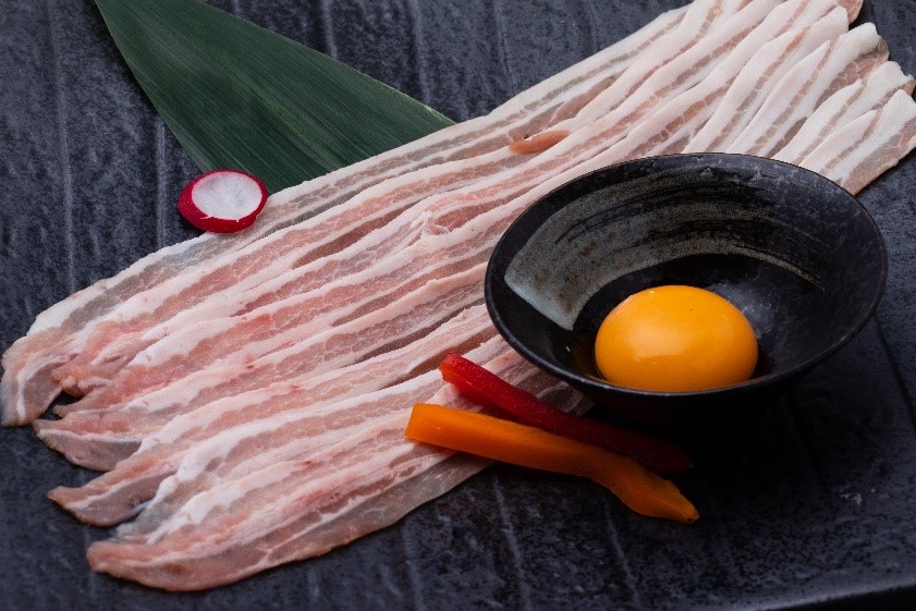 うま味を凝縮したやわらかな肉質、とろけるような甘みのある肉脂が特長で、コラーゲンやビタミンB群を多く含んでいるという伊都豚。その肉の表面に、すき焼き風の特製割りしたをぬり、サッと焼いて卵黄に絡めて食べると、伊都豚の甘みと卵黄の濃厚な味わい、特製割り下が絡み合い、絶妙なバランスです。