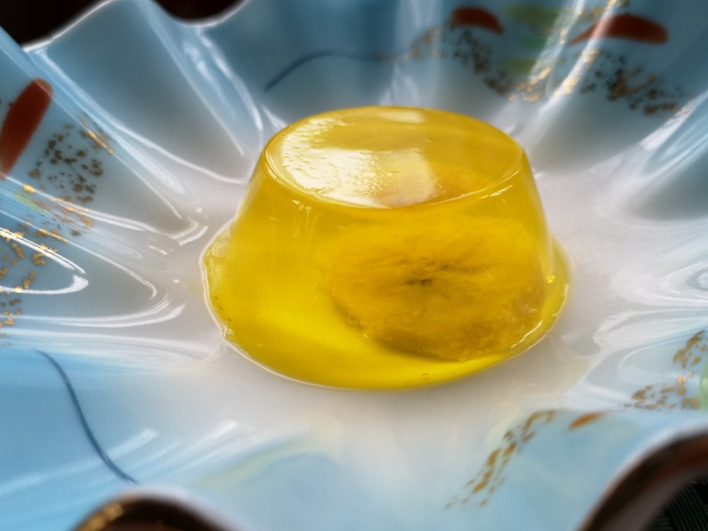 西洋を感じさせる器に入った固めのバナナゼリーは透明感のあるバナナ色で、一口大。食後のお口直しにぴったりのデザートです。