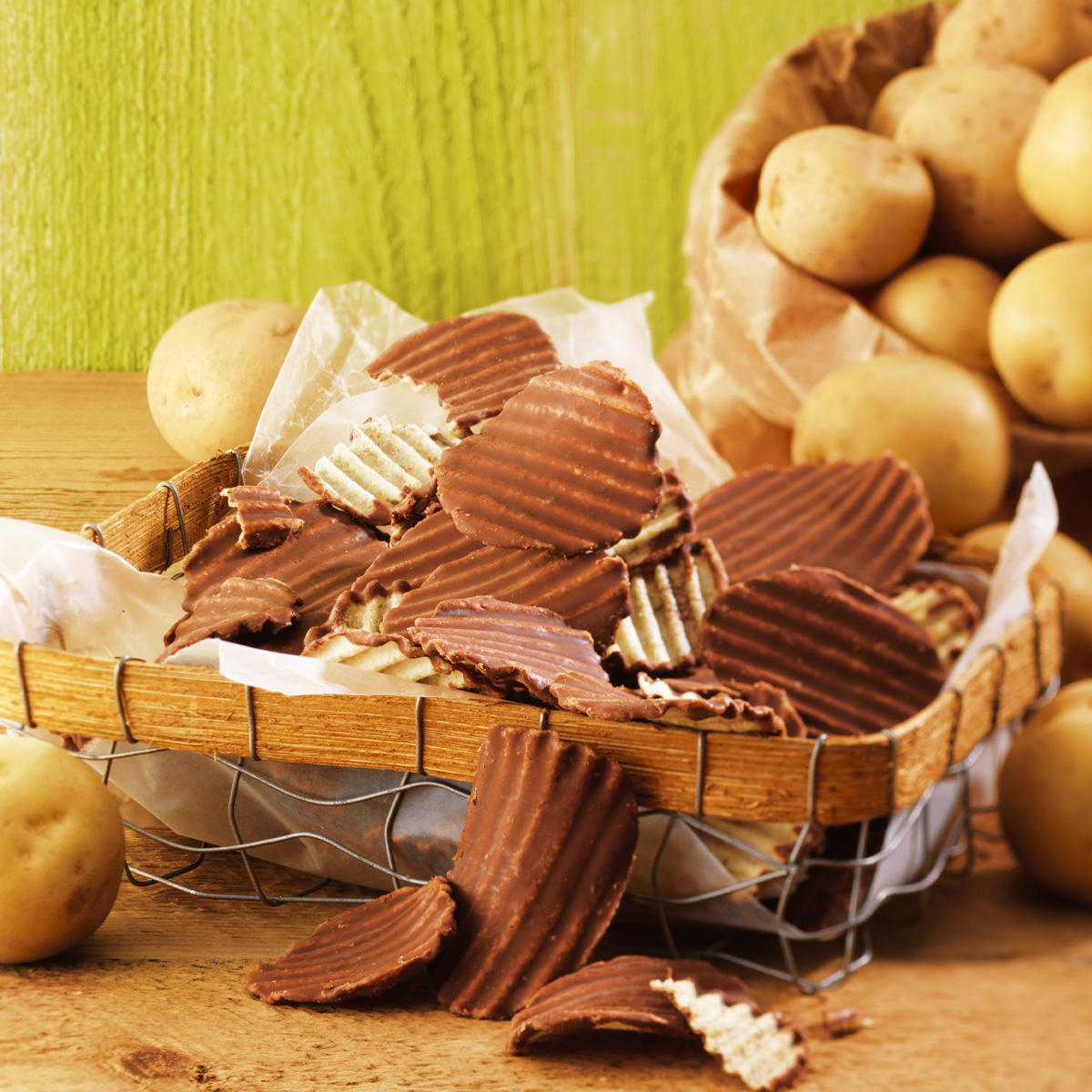 「ポテトチップチョコレート[新じゃが]」は、ロイズふと美工場のある北海道・当別町で今年収穫された『新じゃが』のみを使用したポテトチップの片面に、口どけの良いまろやかなチョコレートをコーティングしています。ミルクの風味が感じられるまろやかでやさしい口あたりのチョコレートをコーティングすることで、新じゃがの味わいをより楽しめるとのことです。