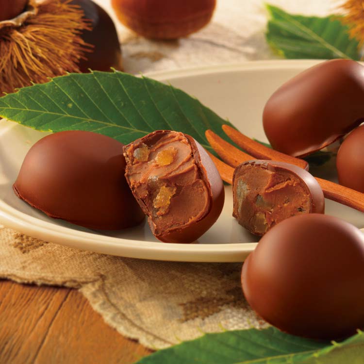 「栗のショコラ」は、栗風味のなめらかなミルクチョコレートガナッシュにイタリア産の栗を使ったマロングラッセの粒を混ぜ込んで、甘さ控えめのチョコレートで包んだもの。隠し味の栗のリキュールが風味をさらに引き立てます。