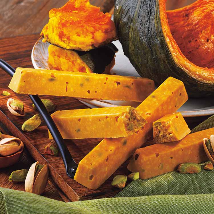 「ロイズバーチョコレート[南瓜とピスタチオ]」は、かぼちゃパウダーとカラメルシュガーパウダーを練り込んだチョコレートに、ローストしたピスタチオとパンプキンフレークなどを詰め込みました。かぼちゃの風味とピスタチオの香ばしさ、ザクザクとした食感の調和が楽しめます。