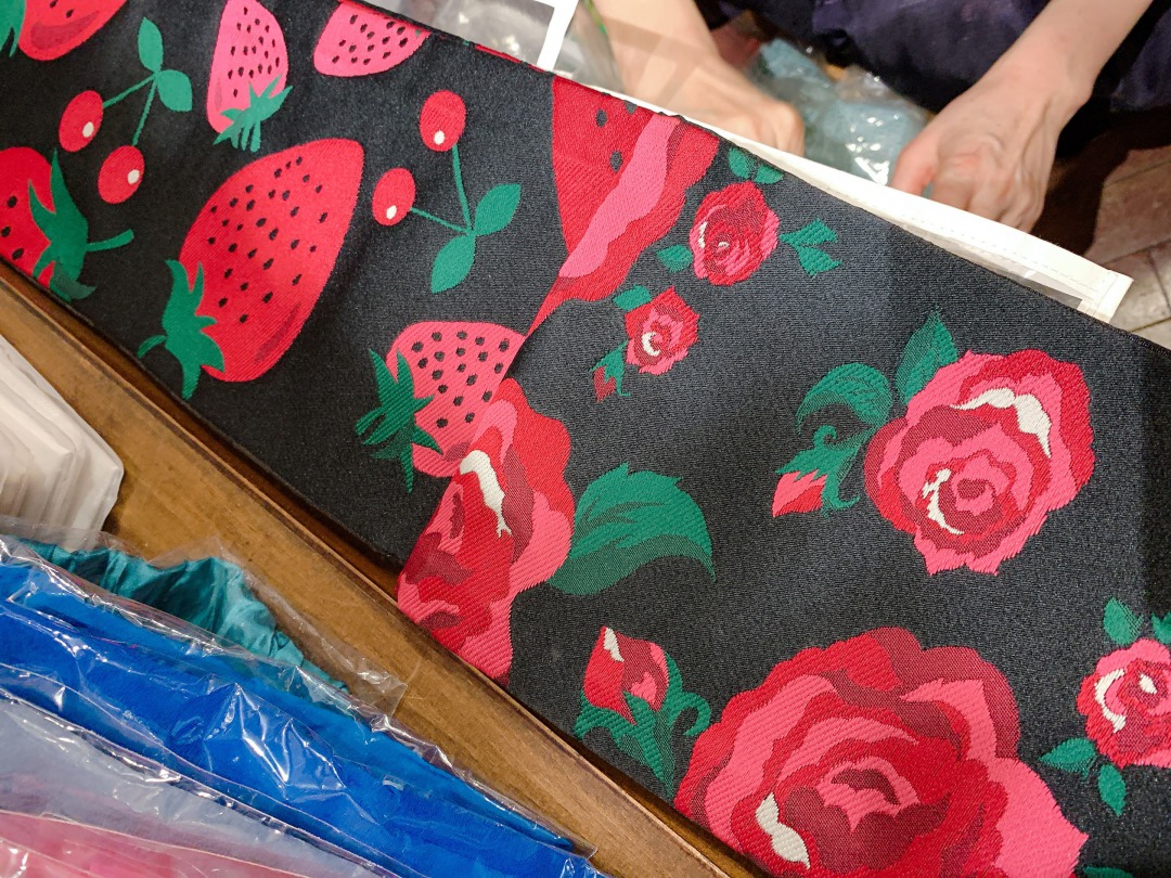 「イチゴやバラ、英語でロゴが入っている帯なんかもあります。昔では考えられなかった色合いを使用したものもありますね。ピアスやイヤリングなどのアクセサリー、バッグにしても、現代に合わせたものが増えました。リュックサックもありますよ!ちりめんでできたリュックサックです。ユーモアのある柄や、自分がかわいいと思った柄を揃えています」
