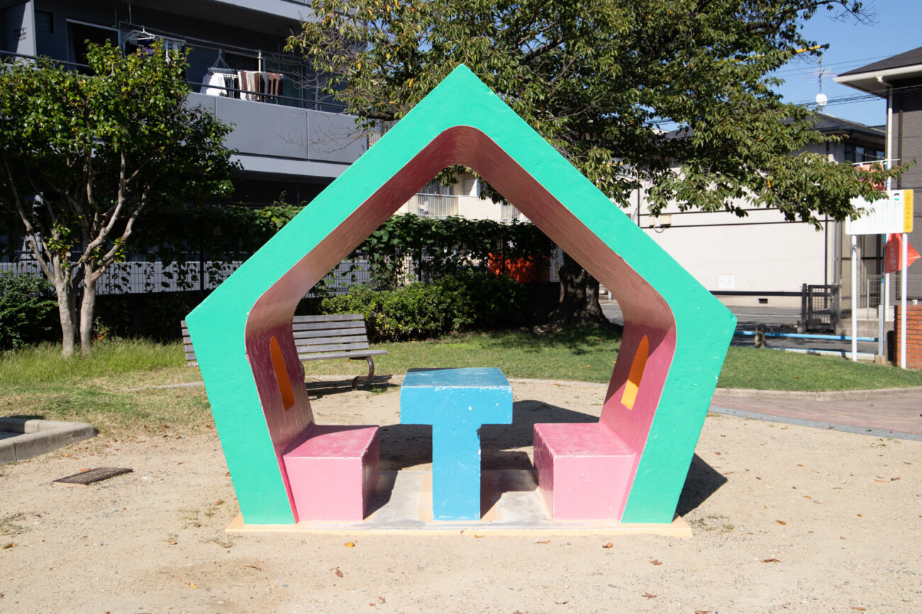 パンダの後ろには、家の形をしたコンクリートの遊具。