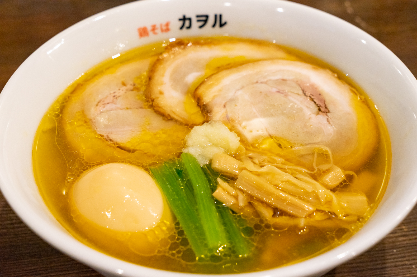 鶏、豚、野菜、魚介のうま味を凝縮させた店主こだわりのスープが自慢の同店。今回は「鶏そば 塩 チャーシュー味玉」を注文しました。