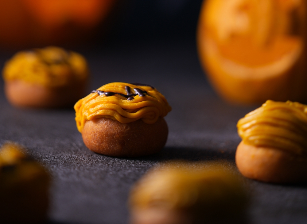 オレンジ色の「ハロウィーンカボチャ」は、秋の味覚・かぼちゃの甘味をバターのまろやかなコクが引き立てるソースでコーティングした『ジャック・オー・ランタン』。