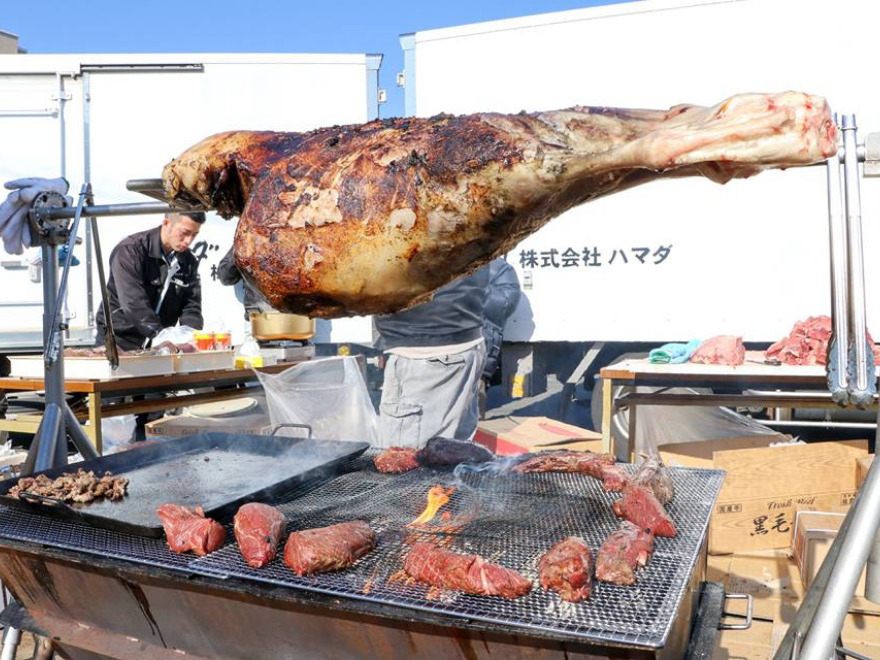 中でも注目は「牛の丸焼きエリア」。今回は2本の牛の丸焼きが準備され、アンケートに回答した先着1000人に無料でお肉がプレゼントされます。午前10時~午後2時、午後2時~午後6時の2部制で、各部500食です。