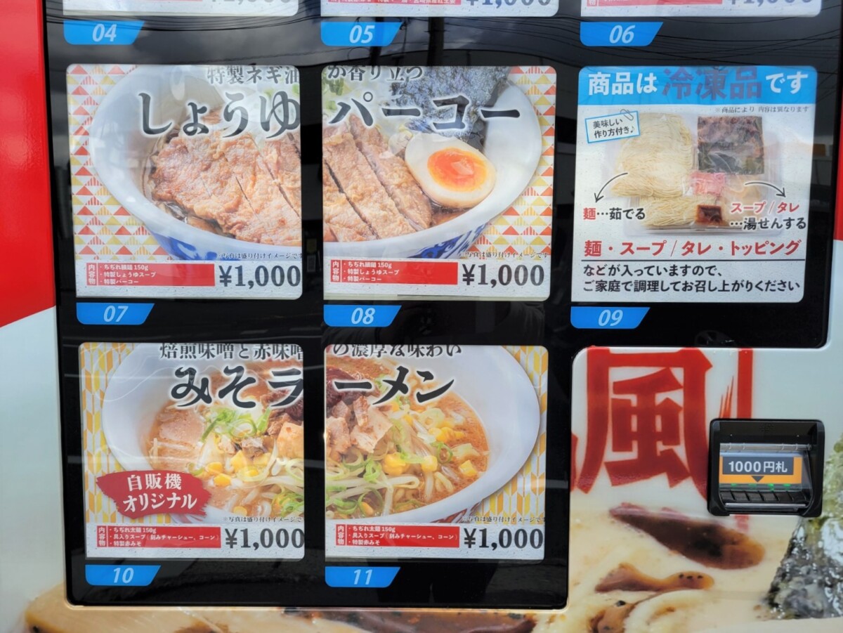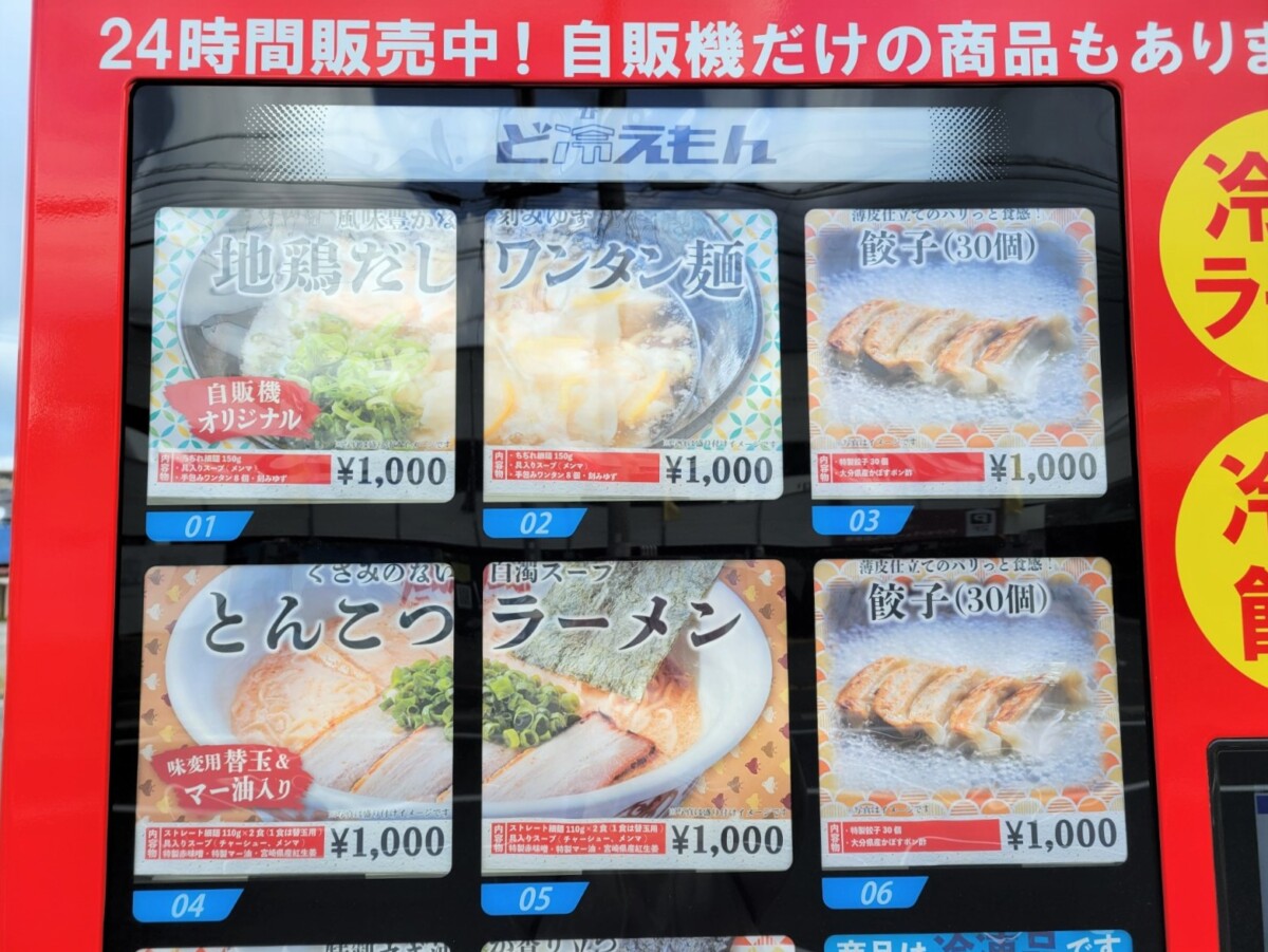 自販機で購入できるのは「地鶏だしワンタン麺」「とんこつラーメン」「しょうゆパーコー」「みそラーメン」「餃子(30個)」で、いずれも冷凍品で、価格は1000円。24時間いつでも好きなタイミングで購入できます。