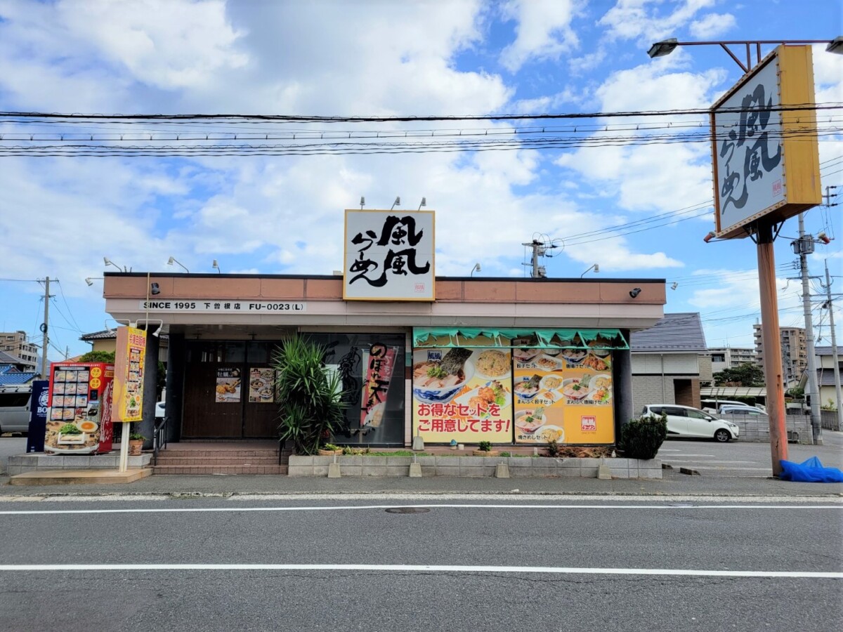 JR下曽根駅の北口を出て、「寺迫口」交差点の方角へ向かって3分ほど歩くと右手側に見えてくる「風風ラーメン 下曽根店」。