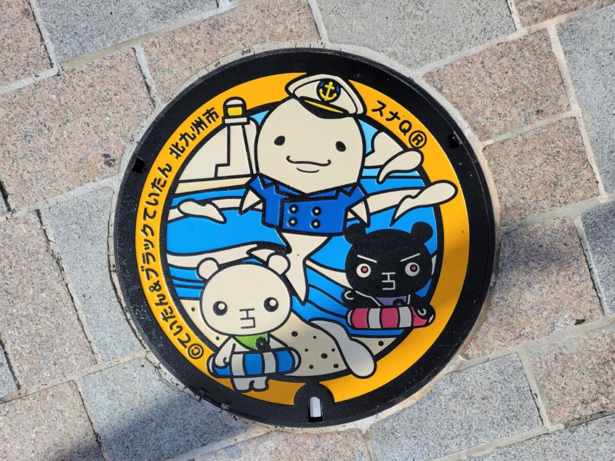 北九州港のマスコットキャラクター「スナQ」が描かれたマンホールには、海と灯台、そして浮輪をつけた「ていたん&ブラックていたん」も描かれています。