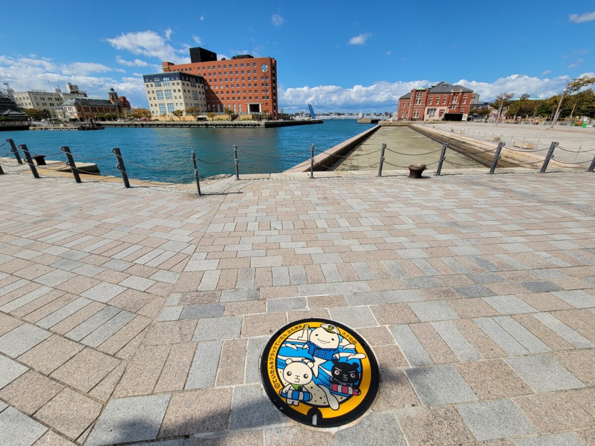 マンホール越しに、「旧門司税関」「ブルーウィングもじ(はね橋)」「プレミアホテル門司港」など門司港らしい風景も楽しむことができます。