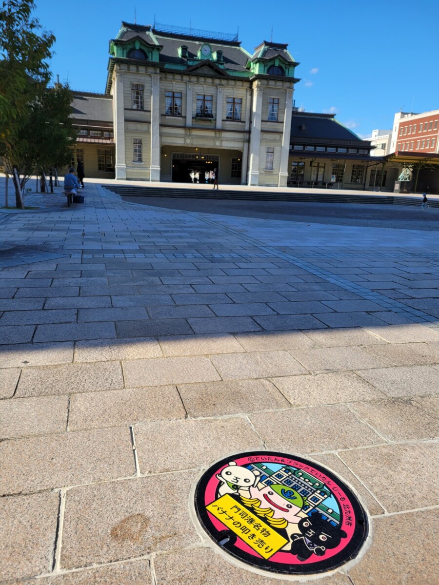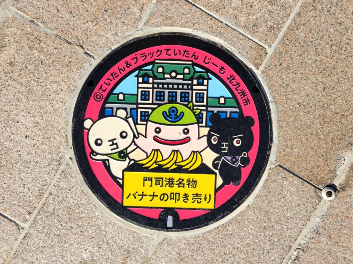 JR門司港駅前に設置されたのは、門司区のマスコットキャラクター「じーも」とコラボしたマンホール。