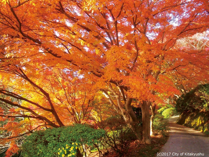 周防灘に面した標高約120m級の丘陵の一角に位置する、市内唯一の花木公園「北九州市立白野江植物公園」。毎年秋には、モミジ約800本などの落葉樹が一斉に紅葉し、園内を赤や黄に染め上げます。