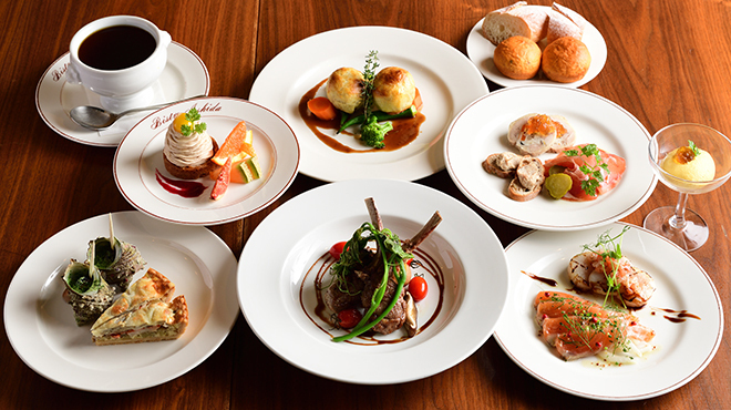 毎年心待ちにしている人も多いという「ビストロいしだ」の「クリスマスディナー」(1人9900円)は全9品。「アミューズ(本日の一品)」「冷たい前菜の盛り合わせ」「温かい前菜の盛り合わせ」「スープ」「魚料理(オマール海老と旬のお魚を使った一品)」「肉料理(シェフのおまかせの一品)」「パン」「クリスマススペシャルデザート」「コーヒー」という内容で、コース料理をしっかり味わうことができます。