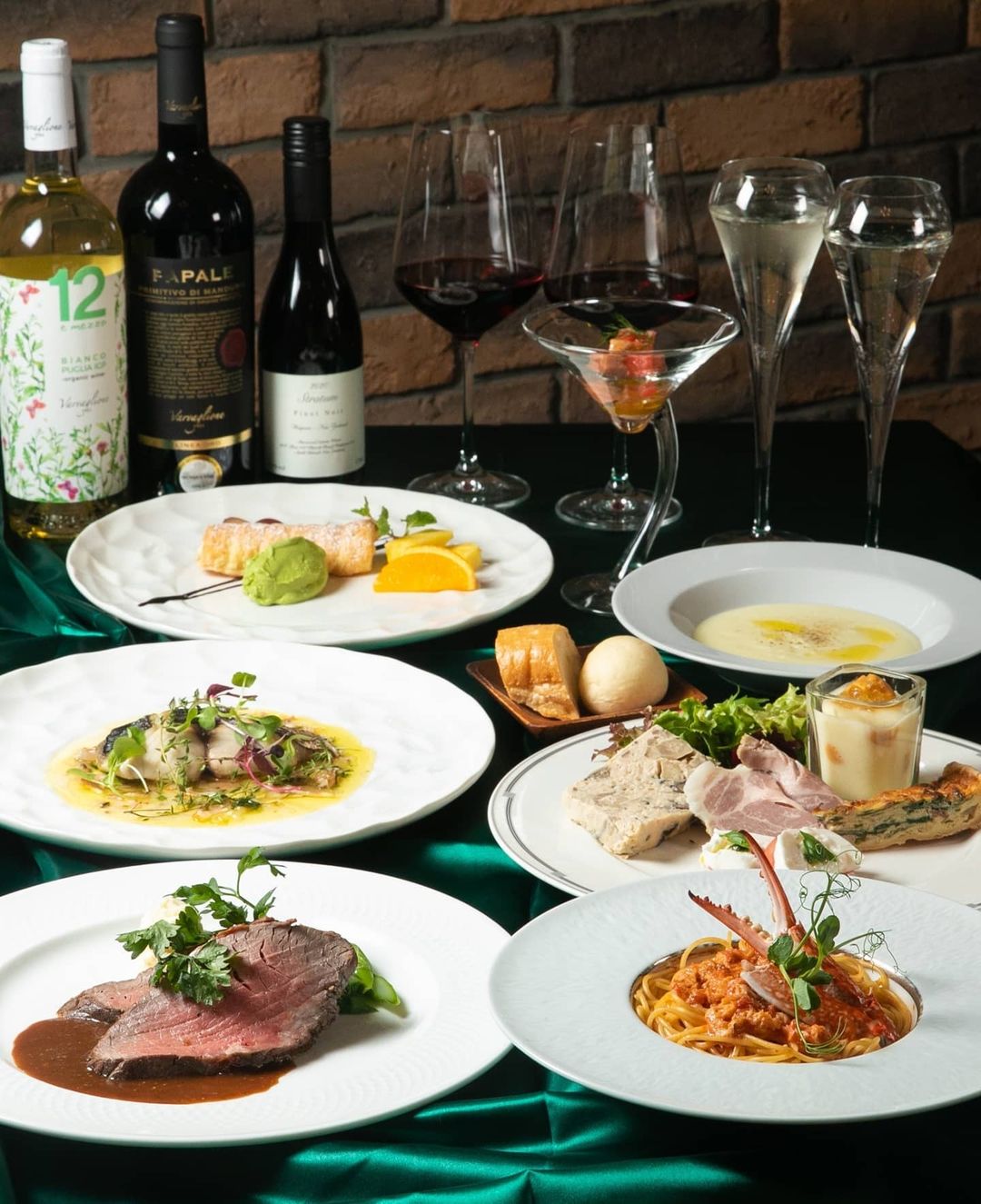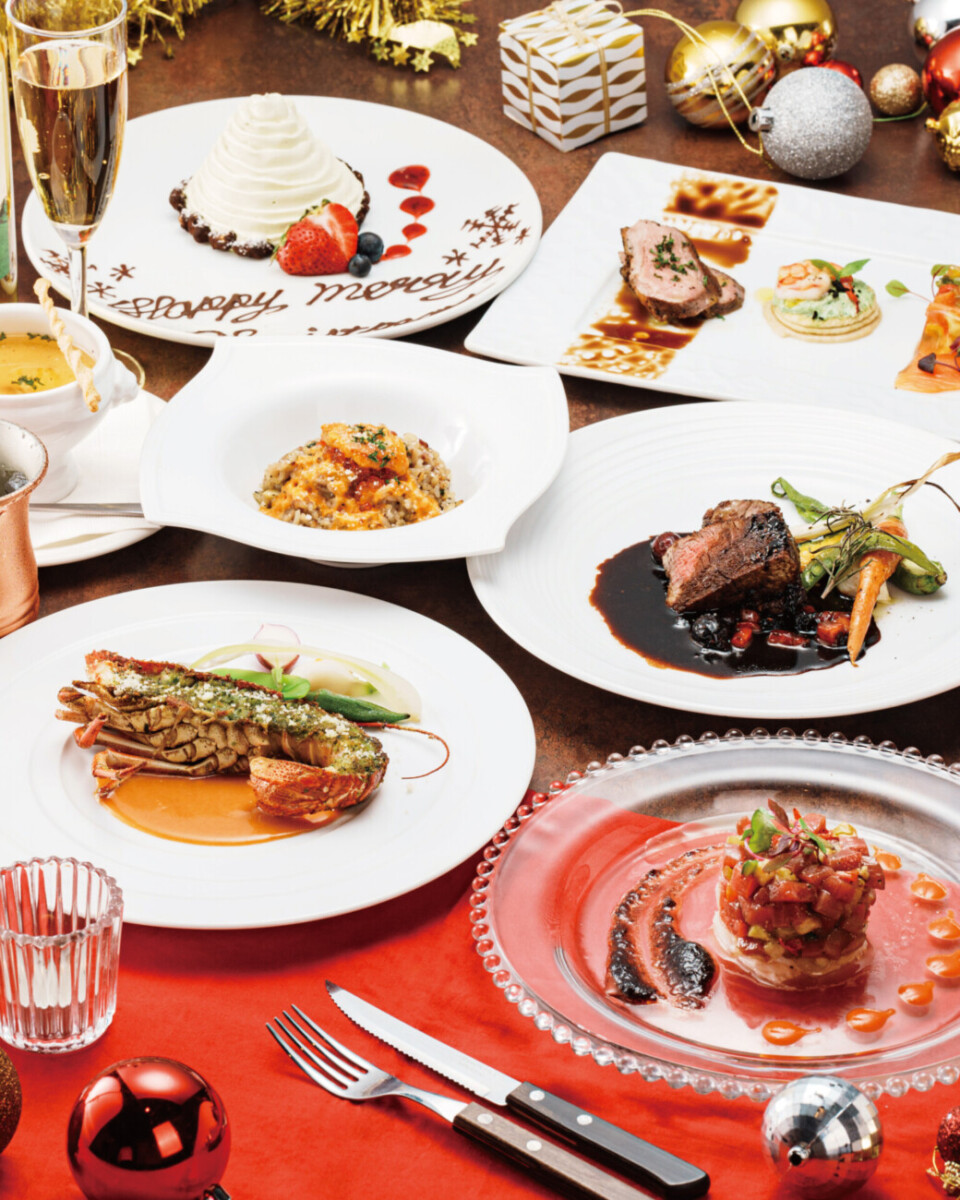 「クリスマスコース」(写真上、1人8000円)は、「5種の前菜盛り合わせ」「オニオングラタンスープ」「ウニトマトクリームリゾット」「真鯛のバジルサルティンボッカ スキャンピのテルミドール」「国産牛ヒレグリル シャンピニオンとポルチーニ茸グレイビーソース」「ベイクドアラスカ」の全6品。デザートの「ベイクドアラスカ」には無料でメッセージを付けてくれるそうなので、恋人へのサプライズにも喜ばれそう。大切な人とのロマンチックなひとときを過ごしたい人にピッタリな内容です。プラス1000円で飲み放題90分追加可能。