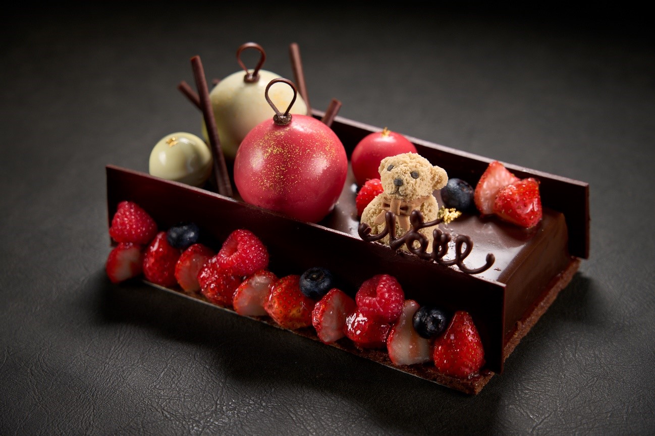 「Noël Glamour ~ノエル・グラムール~」は、ホテル内のツリーやレストラン店内に登場するテディベアをモチーフに、オーナメントに仕立てたムースや福岡ブランドのあまおう苺を飾り、クリスマスの魅力を詰めたパティシエこだわりのフルハンドメイドの一品。