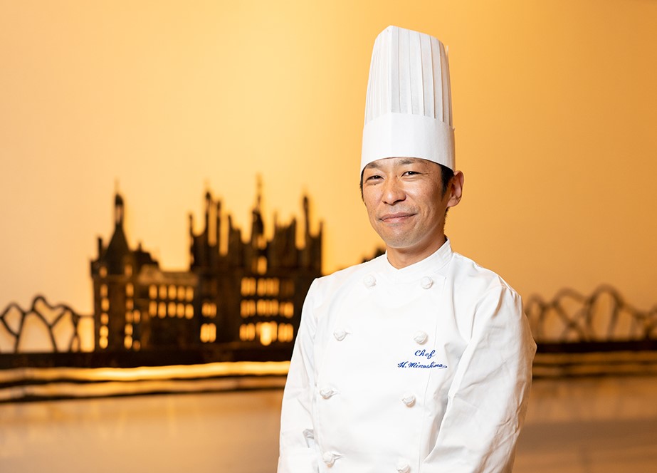 調理専門学生時代に校外授業でリーガロイヤルホテル(大阪)のフレンチレストランを訪れた際に、シェフがひとつひとつの料理に手間をかけ丁寧に作り上げていく工程や実際に口にした料理に魅力を感じ、フレンチの道を志すようになったという蓑島シェフ。2003年にリーガロイヤルホテル(大阪)に入社後、宴会やホテル内のさまざまなレストランで開業当初から同ホテルで脈々と受け継がれてきた伝統ある調理法や技術を学び、フランスでは複数の星付きレストランで研鑽を積んだそうです。