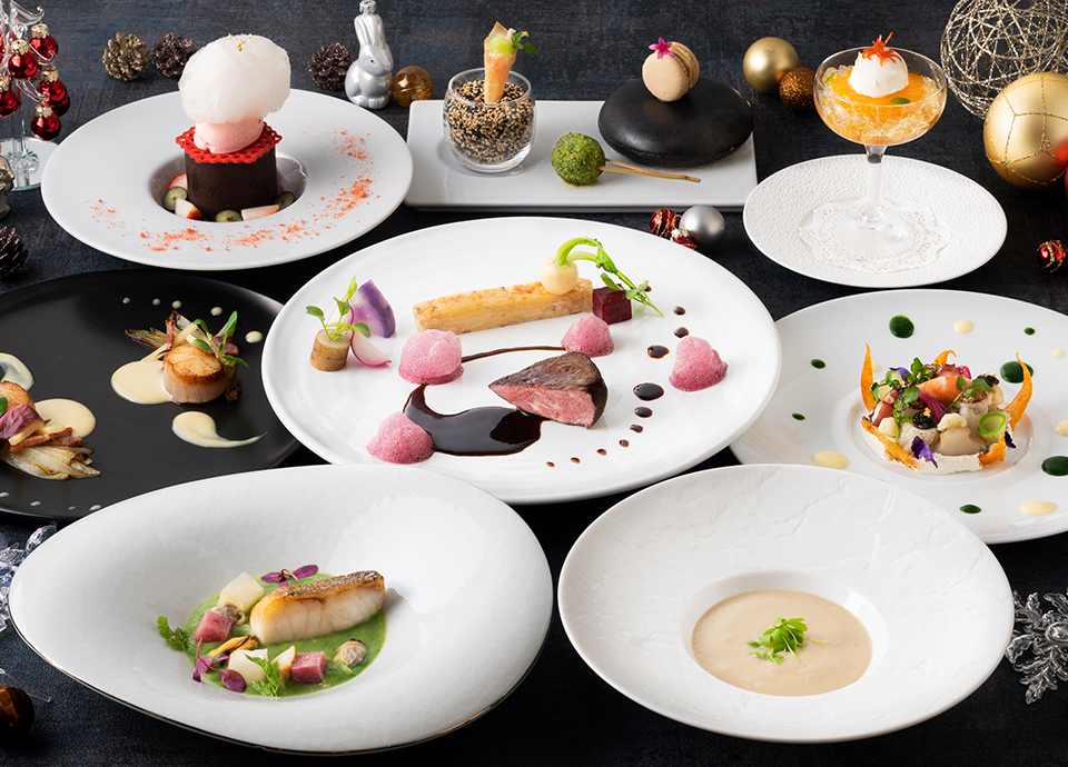 今回クリスマスのひとときを彩ってくれるクリスマス限定メニュー「Noël (ノエル)」は、「3種のお楽しみアミューズ」にはじまり、「九州産天然魚 蕪と貝類のナージュ仕立て」「炭火の香りを付けた おおいた和牛フィレ肉のポワレ 安心院赤ワインのソースとエキュム トリュフ風味のポテトとトピナンブールのグラタン」といったメイン料理、「ミカンのコンポートとフロマージュブランのソルベ」「苺とショコラのティラミス風」のデザートまで、充実の9品。