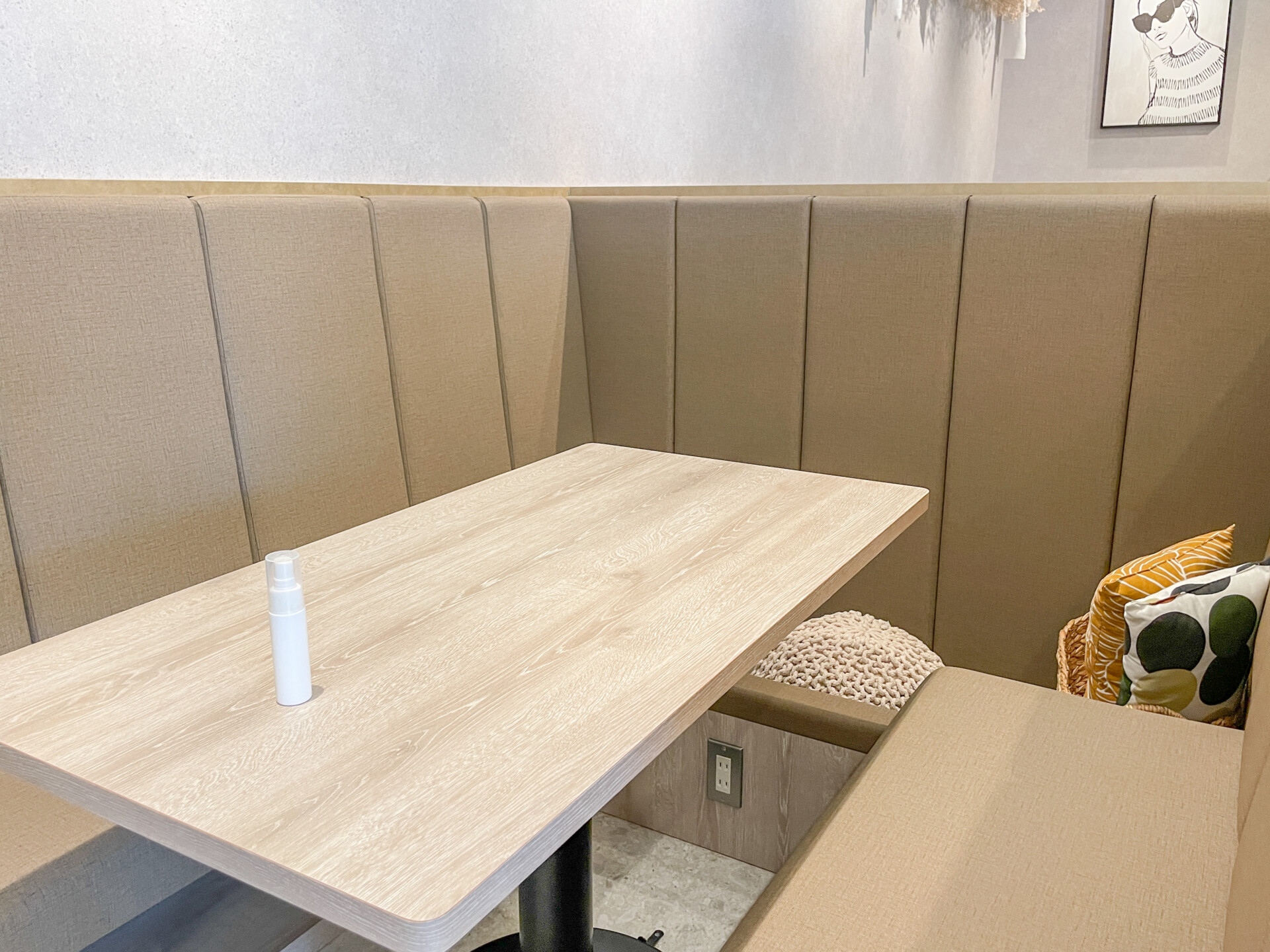 店内ではイートインも可能で、広々したボックス型の4人掛けのソファー席が5つ。背もたれも高さがあるので、子どもを抱っこした状態でもゆったりと過ごせます。