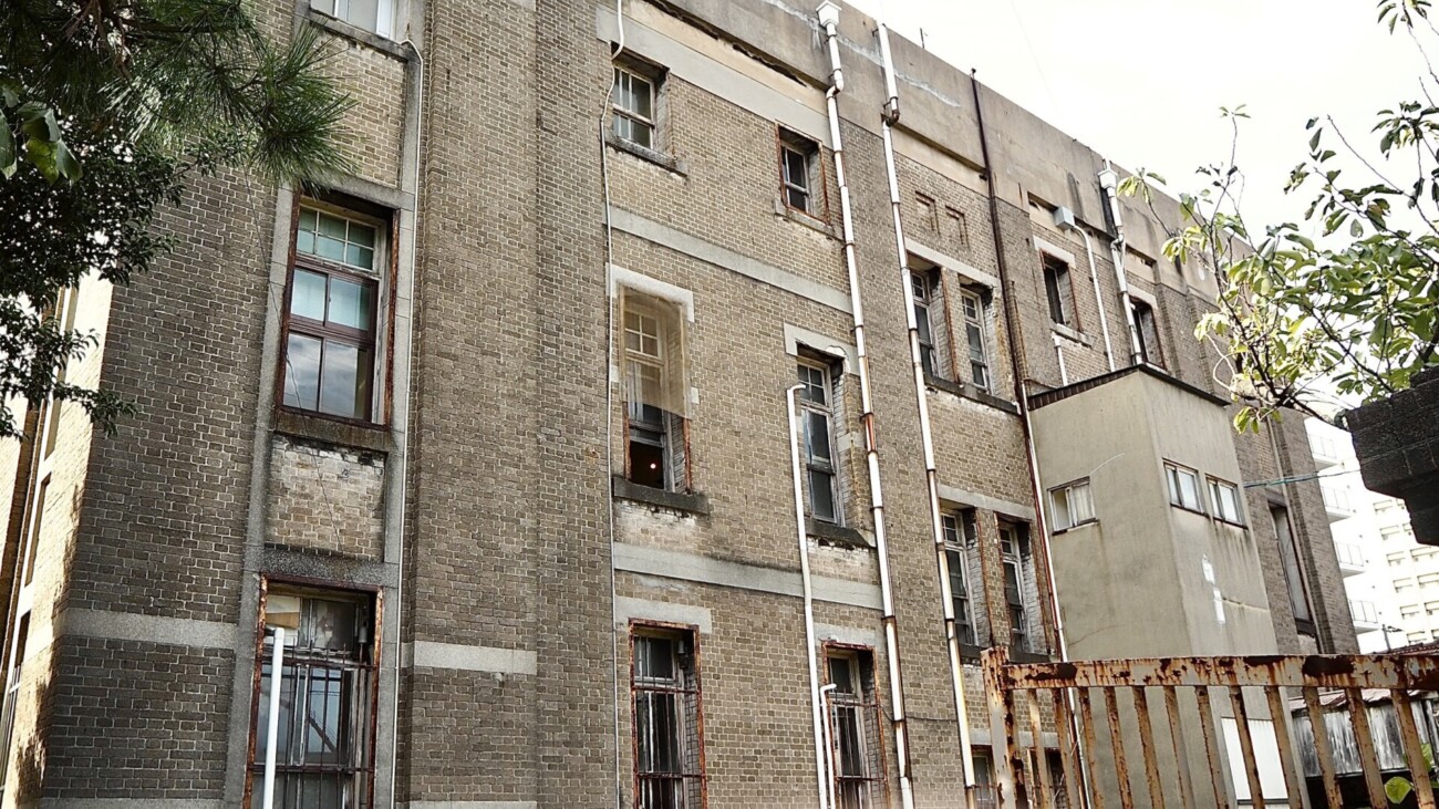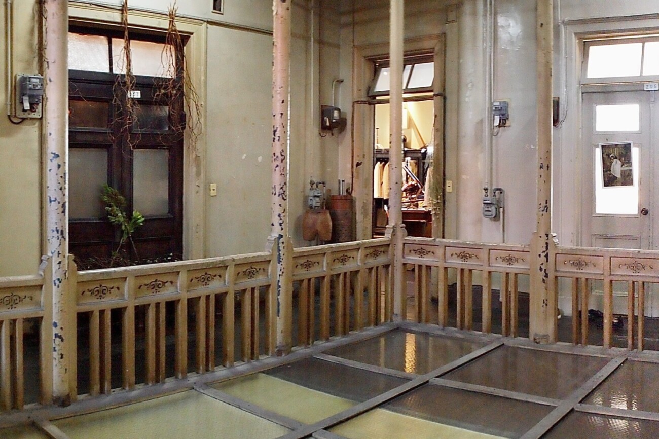 1階正面玄関の増築、看板部分の改造が行われたそうですが、壁や窓の周りは補修されておらず、建設当時のまま残っています。