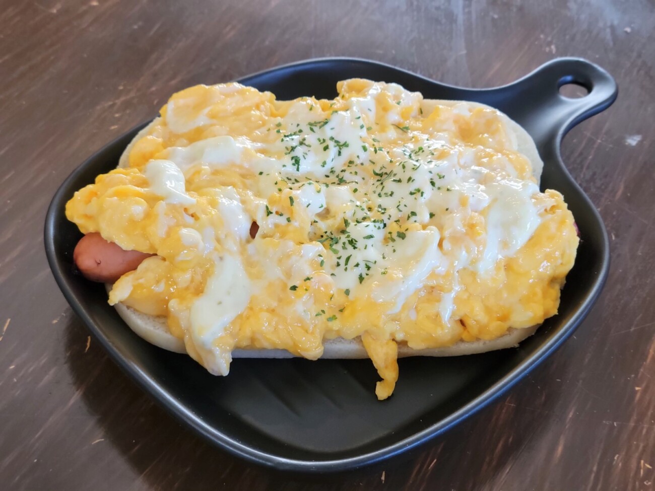 食事系で人気が高いのは「ウインナーチーズタマゴ みやこハムさんウインナー」(550円)。ひらいたコッペパンの上に、「みやこハム」(豊前市)のウインナーととろとろのスクランブルエッグをトッピング。最後に振りかけられた柚子ゴショウがいいアクセントになっています。イートイン・テイクアウトができますが、イートインの場合は陶器に盛りつけられて登場します。見た目よりもしっかりボリュームがあるので、1個でも満足です。アジフライがどーんとトッピングされた「アジタルタル」も好評とのこと。また、トーストされたコッペパンと一緒に本日の日替りサラダなどが楽しめる「コッペいさん スープサラダセット」もあります。