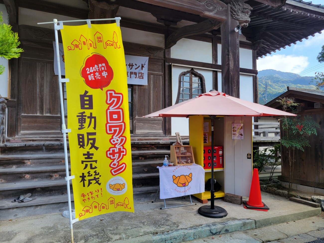 香春町の「道の駅 香春」から車で5分ほどの場所にある「光願寺」の境内に設置された黄色いボックスに入った赤色の自動販売機。ここで購入できるのが、なんとクロワッサン専門店「KAWARASSANT」のクロワッサンなのです。