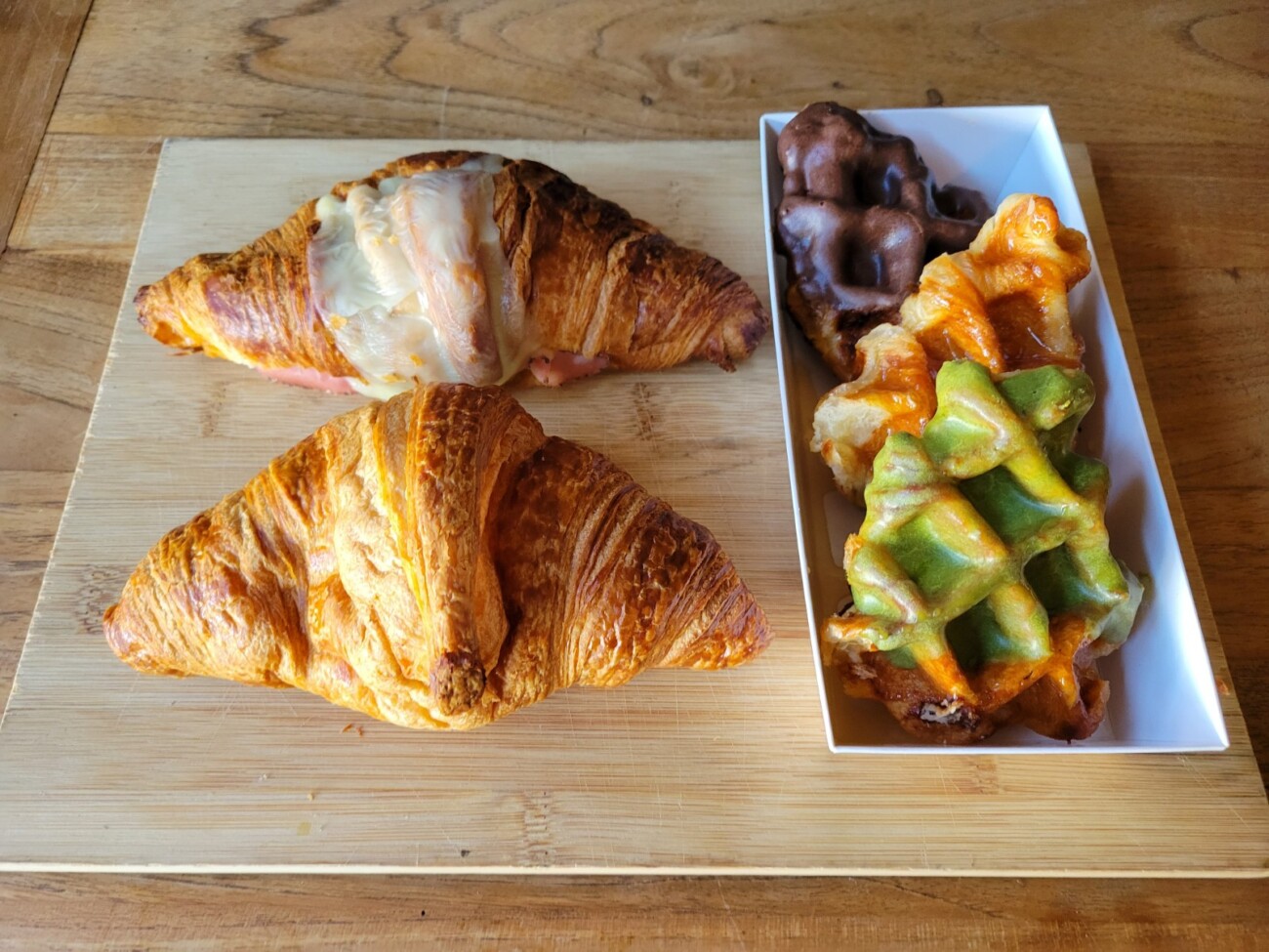 間借りで家賃がかからない分、素材はいいものを使おうと決めた古賀さん。クリーミーな口あたりと芳醇な香りが特長のフランス産発酵バターをはじめ、フランス産の小麦粉や塩を使い、毎朝クロワッサンを焼き上げています。クロッフルに使用しているのも、香春町産のハチミツやベルギー産クーベルチュールチョコなど、こだわりの品々ばかりです。