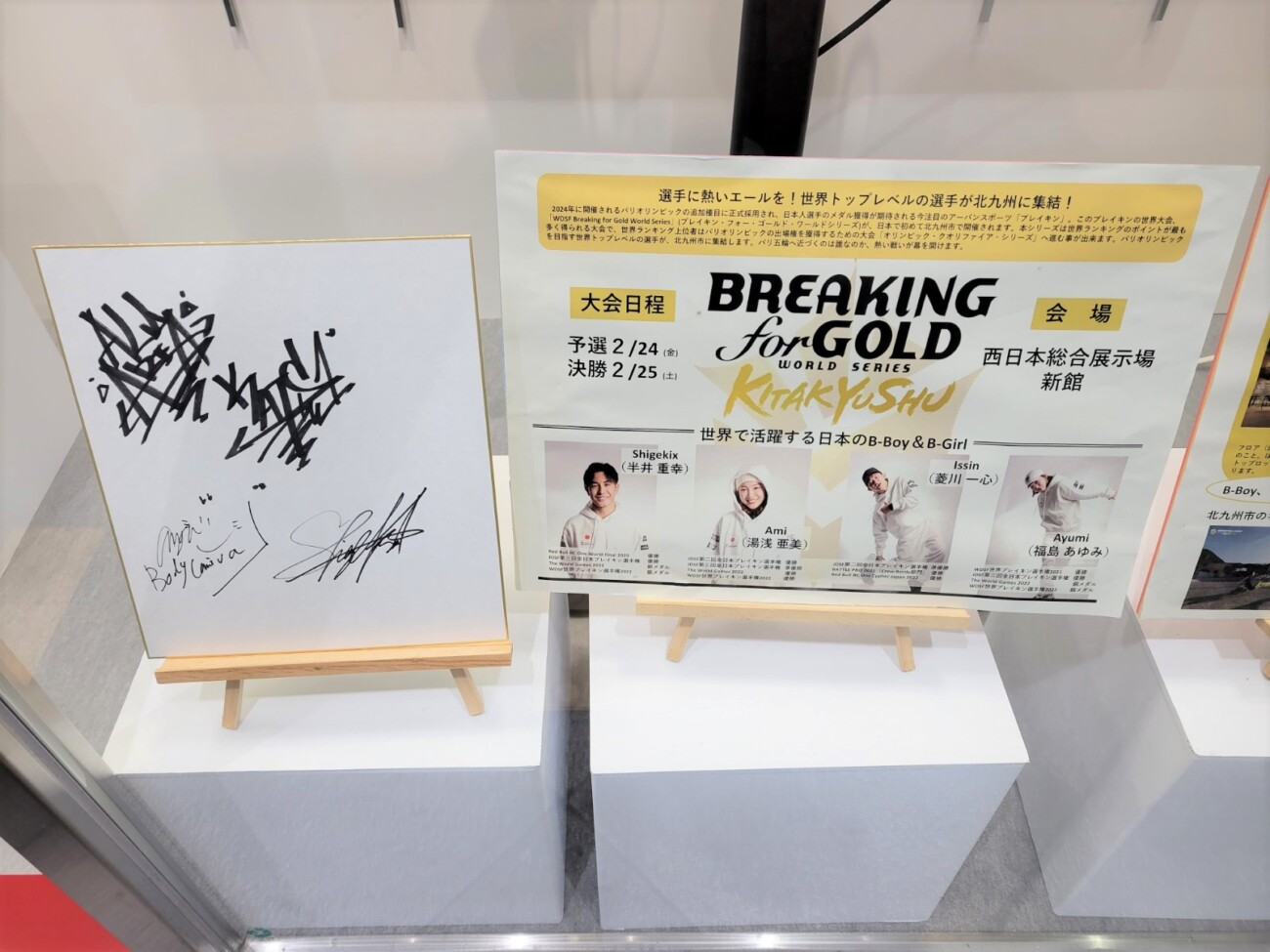 パリ五輪の追加種目に正式採用されたブレイキンの国内初の世界大会であるブレイキンワールドシリーズ「WDSF Breaking for Gold World Series in 北九州」関連では、競技の説明や大会概要のほか、選手のサイン色紙も飾られていました。