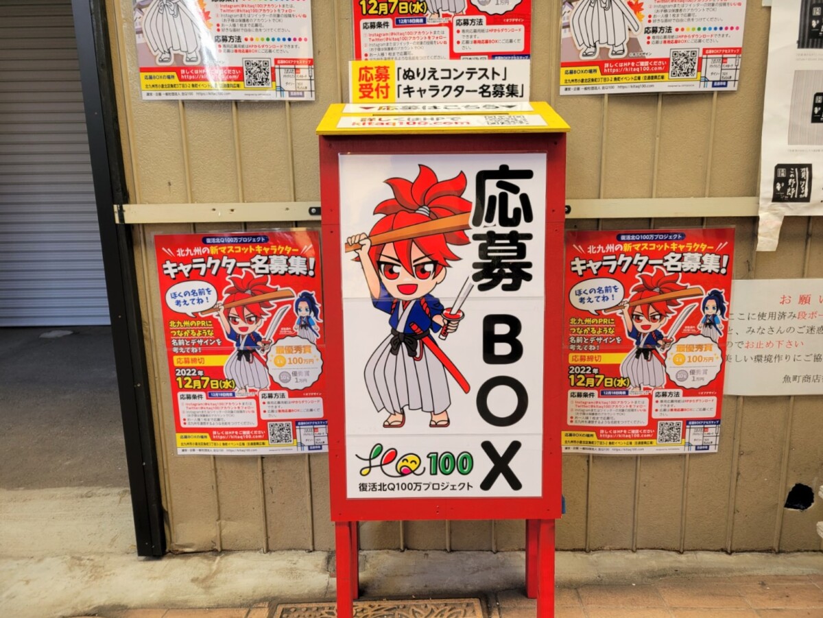 魚町銀天街を歩いていると、魚町イベント広場(旦過復興広場)で、北九州の新マスコットキャラクターの名前を募集するポスターと応募BOXを発見!
