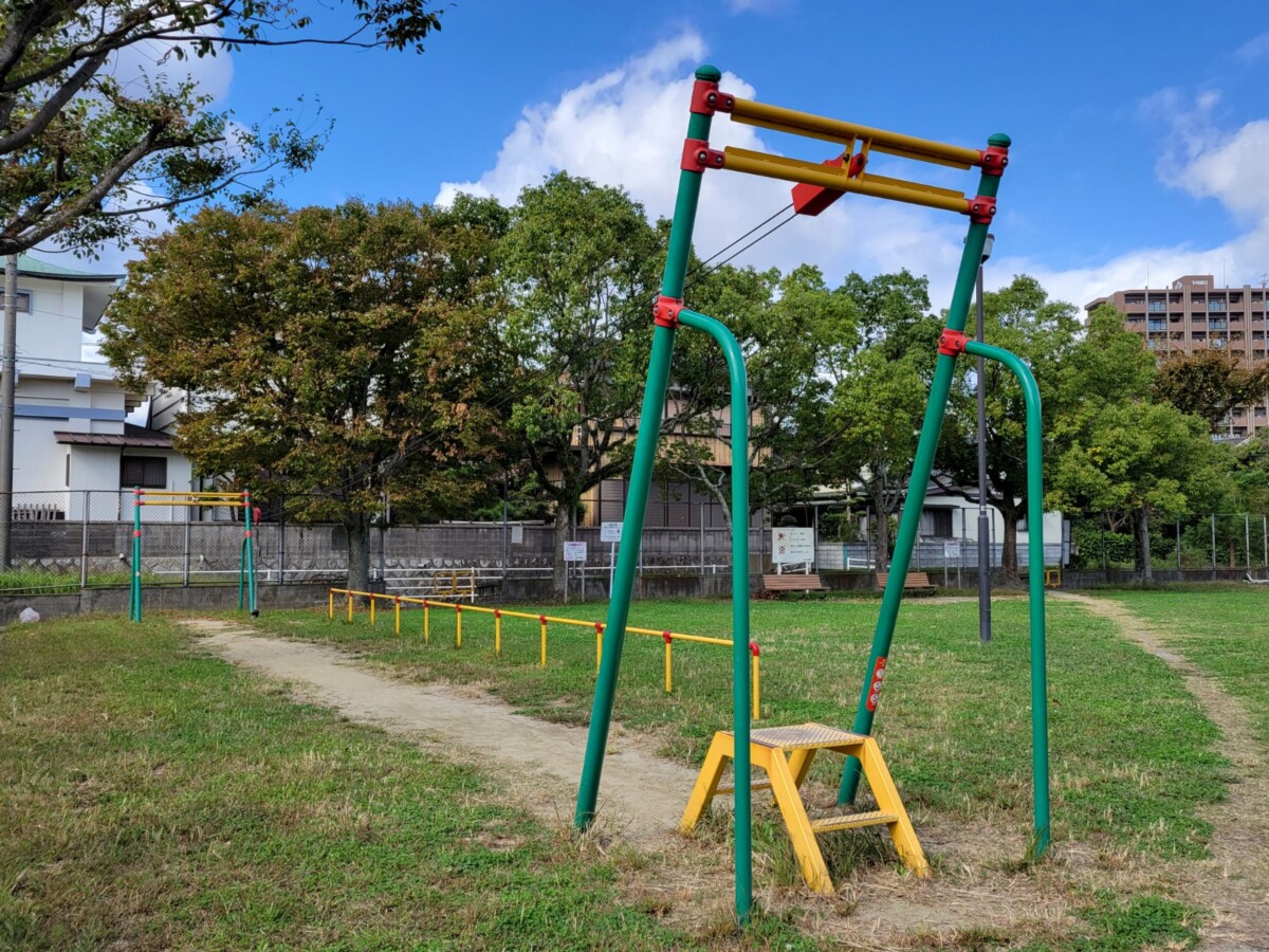 子ども向け遊具・健康遊具ともに数は少なめですが、公園の端に設置されており、それ以外のスペースを生かし、思いっきり走り回れるような広場が広がります。