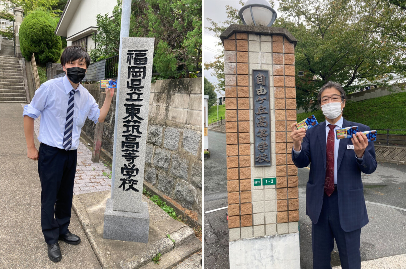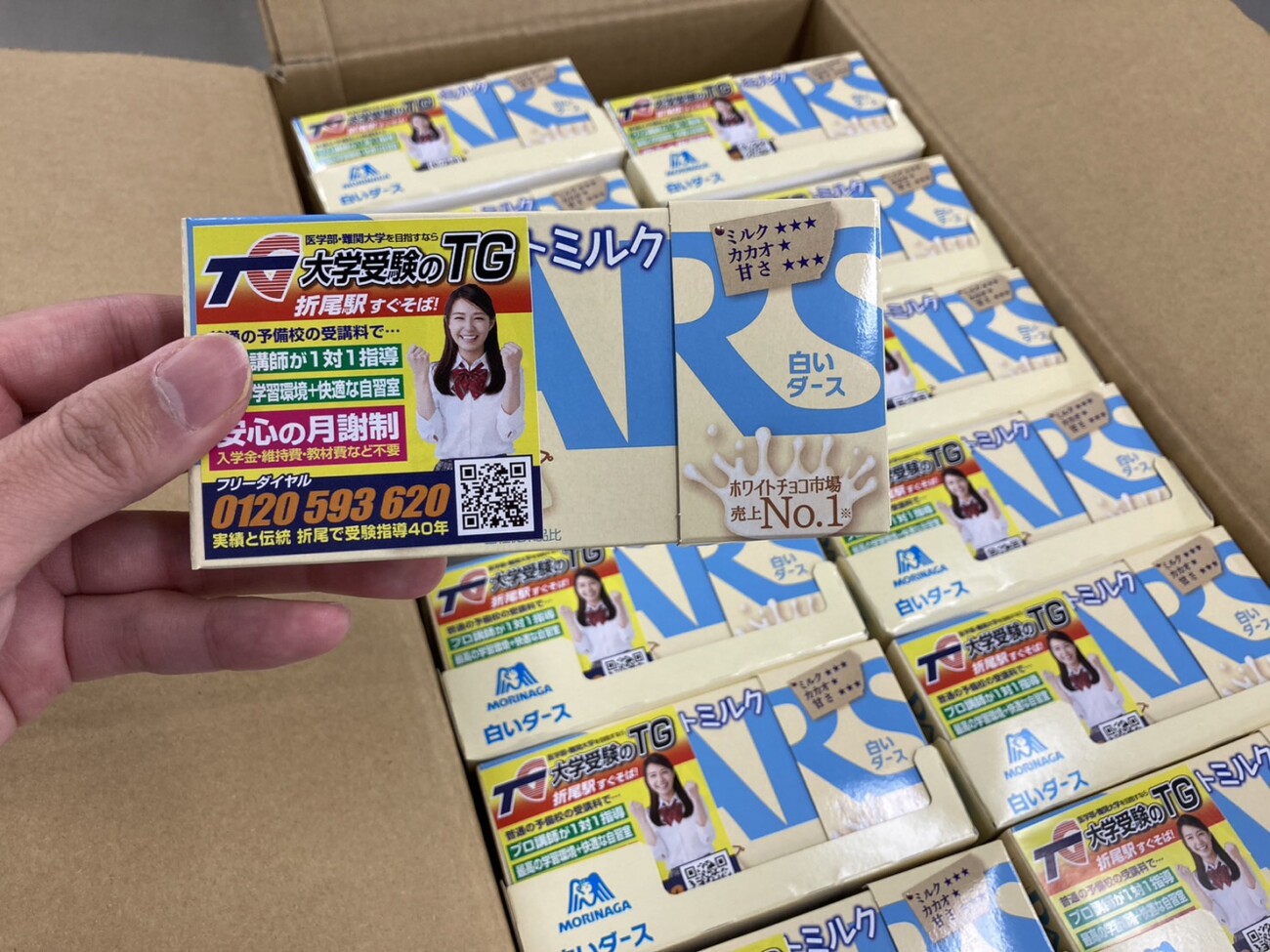 生徒募集の募集として真っ先に思いつくのがチラシの配布ですが、地元に密着した塾予備校ではのオリジナルのアイデアで勝負しなければと「大学受験のTG」では教室のすぐそばにある地元の東筑高校や自由ケ丘高校の生徒たちに喜ばれるものを配ろうと考えたとのこと。生徒の皆さんがもらって嬉しいものとして思いついたのが、夏場は冷たい缶ジュース、暑くない時季はチョコレートだったと言います。