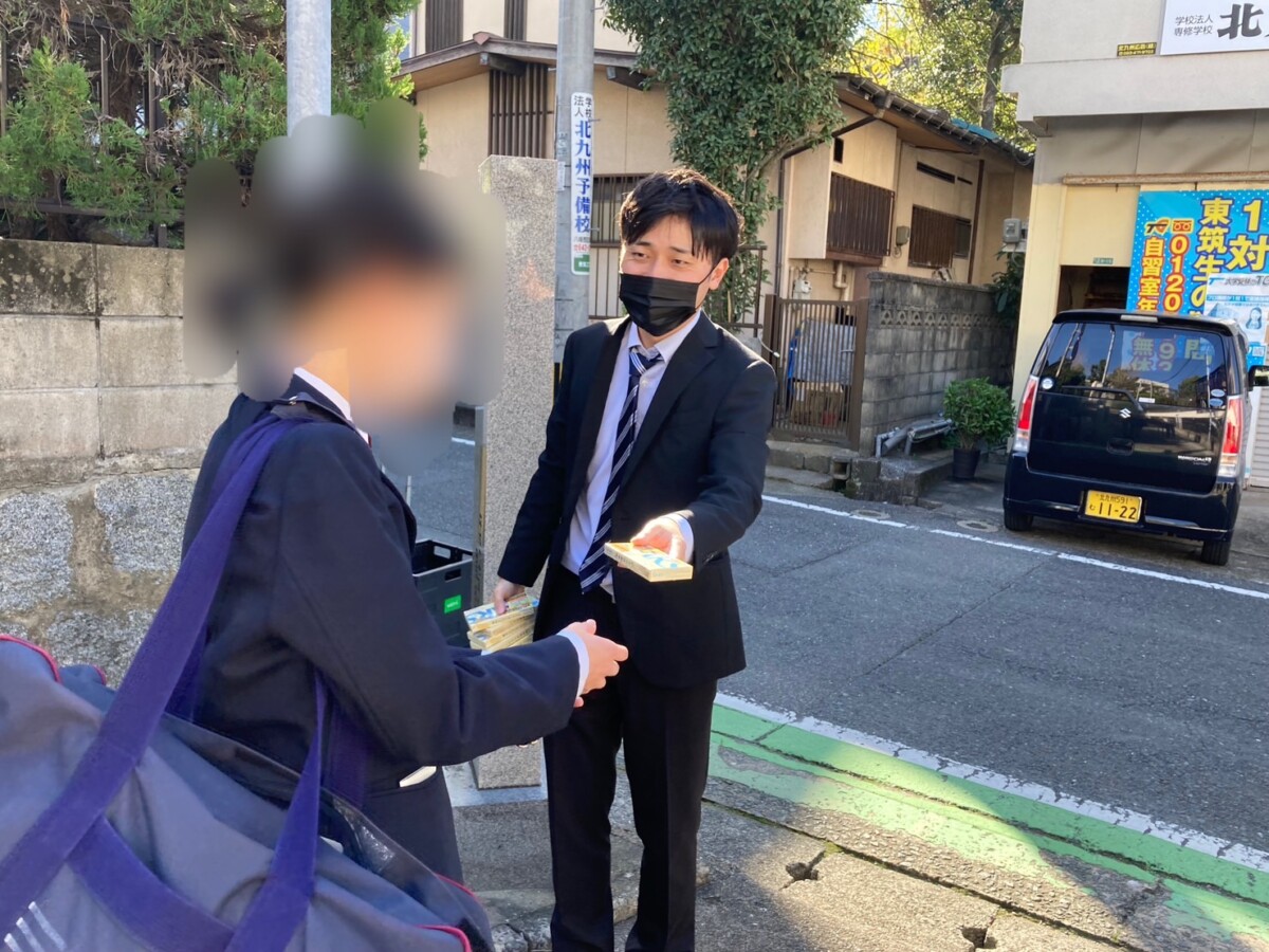 折尾駅近くの高校の校門でチョコレートを配っている人たちの正体は、九州共立大学や九州女子大学などへ通じる「学園大通り」から少し中に入ったところに建つ「大学受験のTG」の講師の皆さん。中間試験・期末試験後に配布することが恒例行事となっているそうで、今年はチョコレート配りを11月18日に自由ヶ丘高校で、11月28日に東筑高校の校門でそれぞれチョコの配布を行ったとのことです。