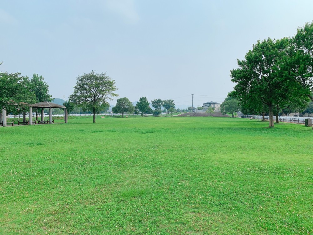 芝生広場もあり、屋根付きのベンチも設置されています。かけっこやボール遊び、ピクニックなど何をするにも適した公園です。