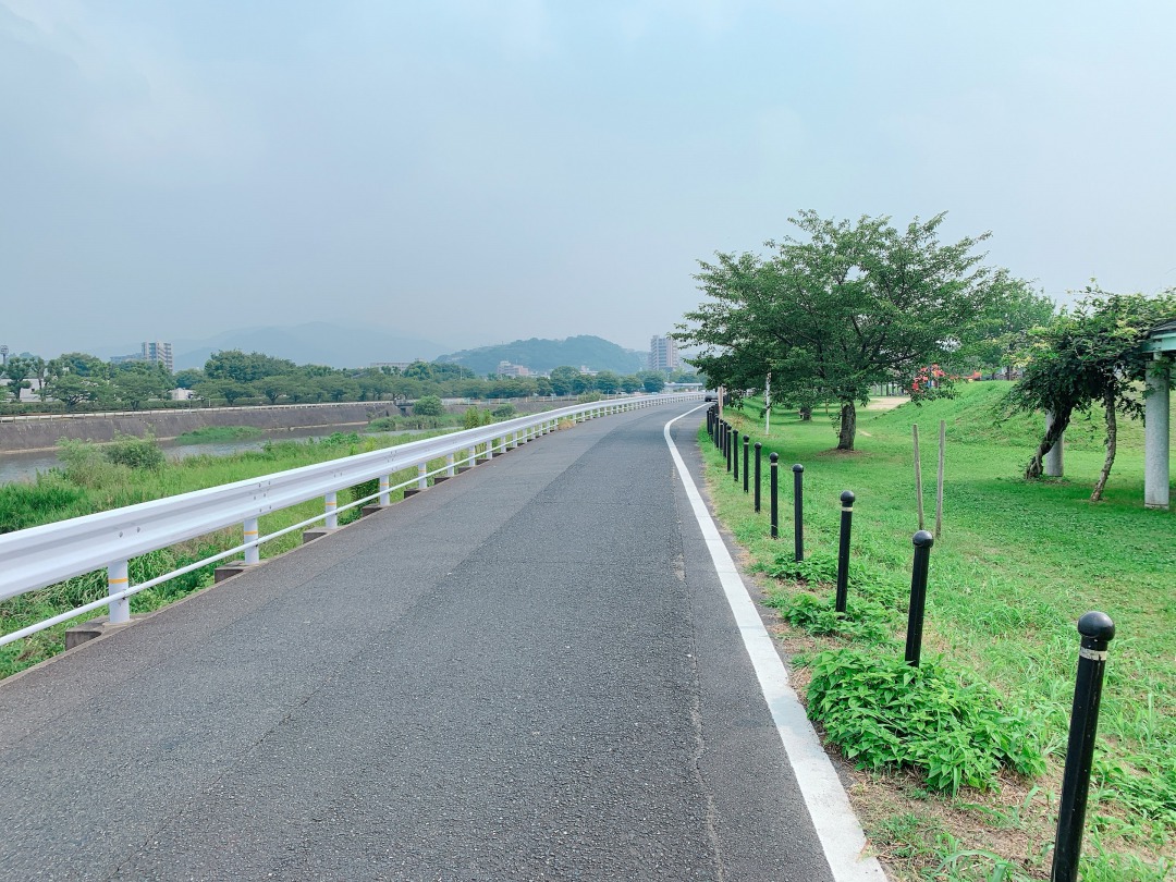 小倉競馬場の裏手に位置する「紫川河畔公園」は、川と緑に囲まれた、遊具が充実した公園です。