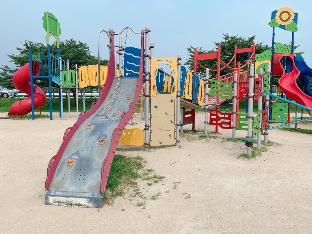 【紫川河畔公園/小倉南区】遊具充実でボルタリングも! 川のせせらぎ涼し