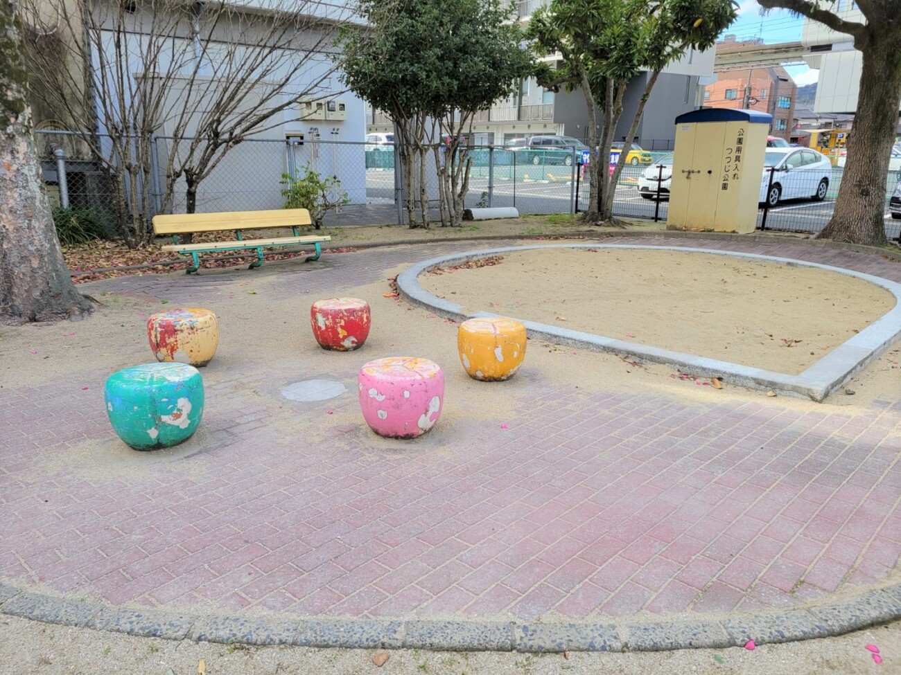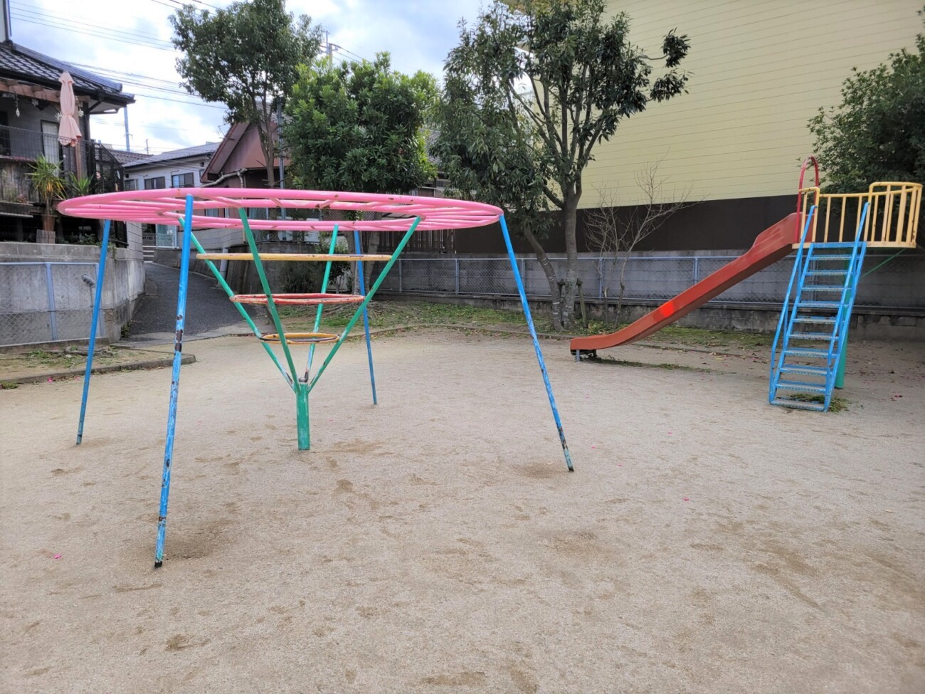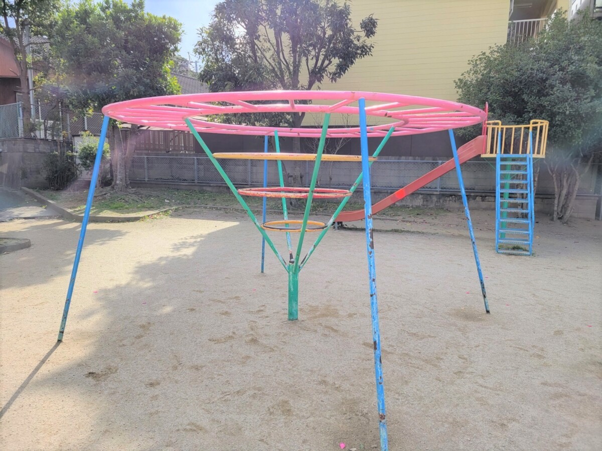 遊具は砂場とすべり台、それと正式名称は分かりませんが円形型の雲梯のようなもの。砂場部分には昔はカラフルだったであろう小さなイスのようなものもありました。