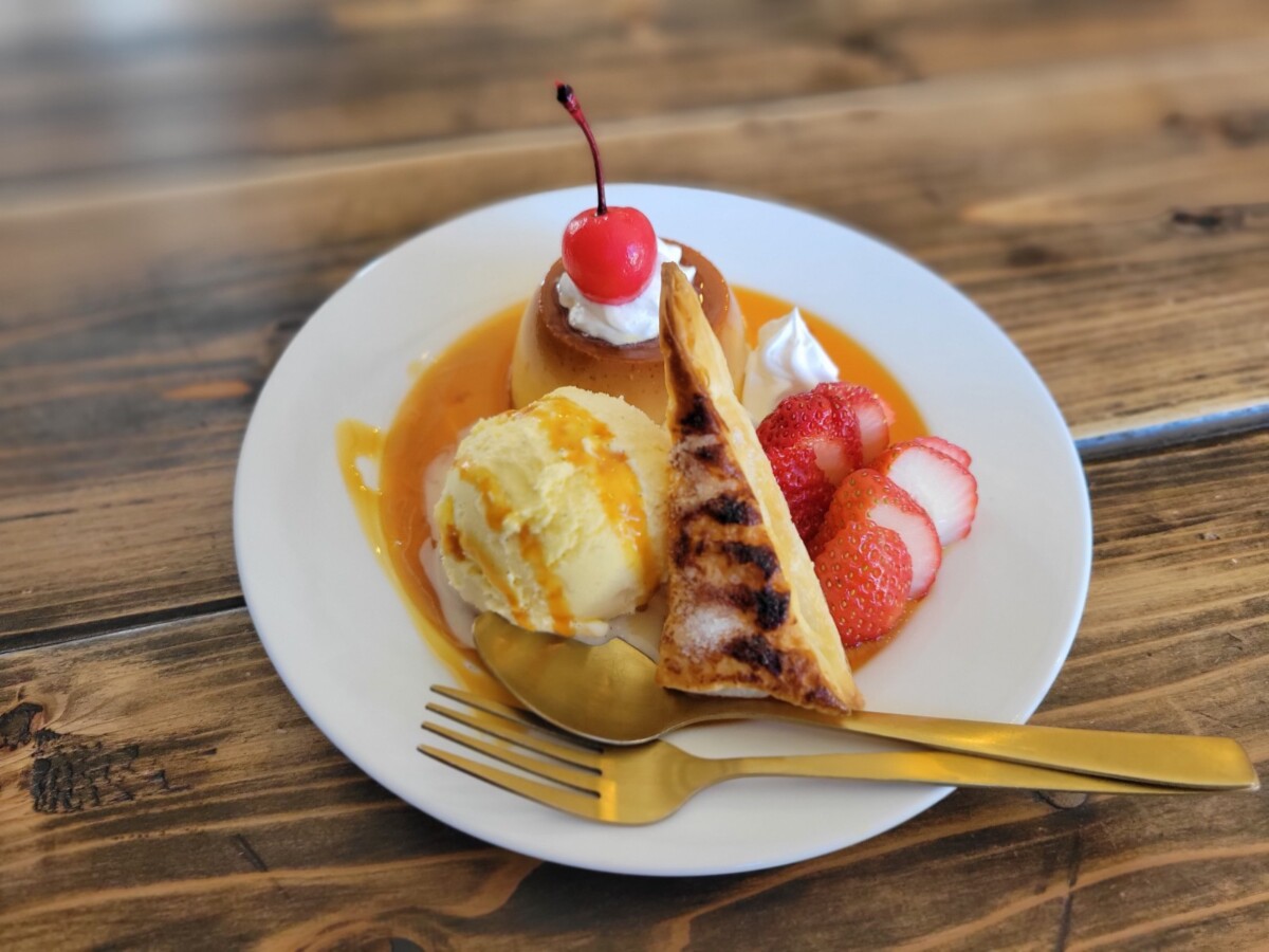 今回のお目当て「プリンアラモード」は、かためのプリンにたっぷりのカラメル、バニラアイスとサクサク食感のパイ、スライスされたイチゴ、生クリームが盛り付けられています。一皿においしいものがギュッと凝縮されていて、幸せな気持ちになりますよ。