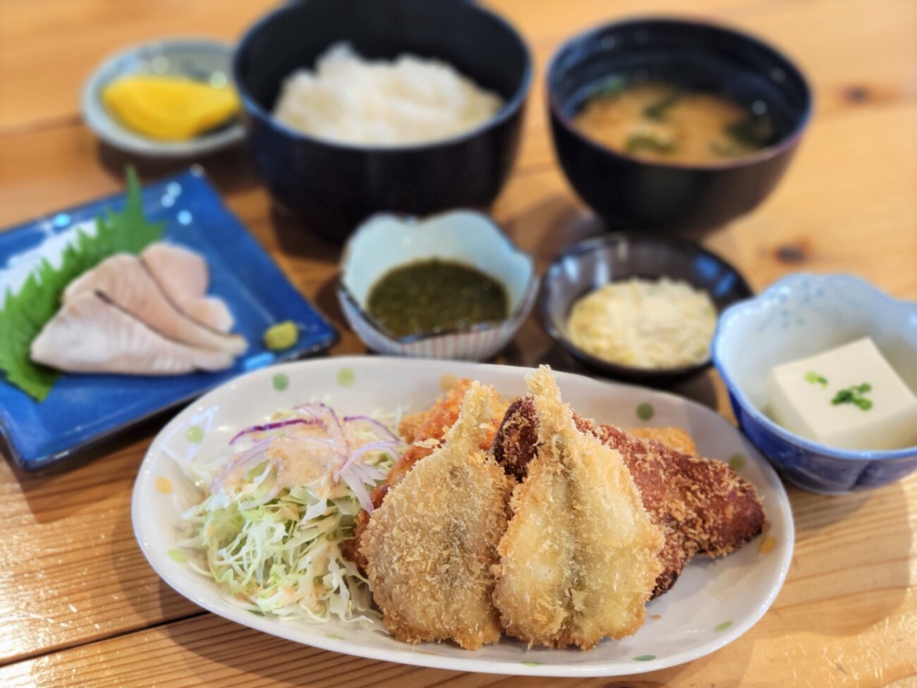 その中から今回注文したのは、年間を通じて提供される「豊前海 地魚フライ定食」(1430円)。ハモやコウイカなど数種類の地魚のフライが盛り合わせになっており、取材日はキス、ハモ、コウイカ、ブリの生姜づけという内容でした。