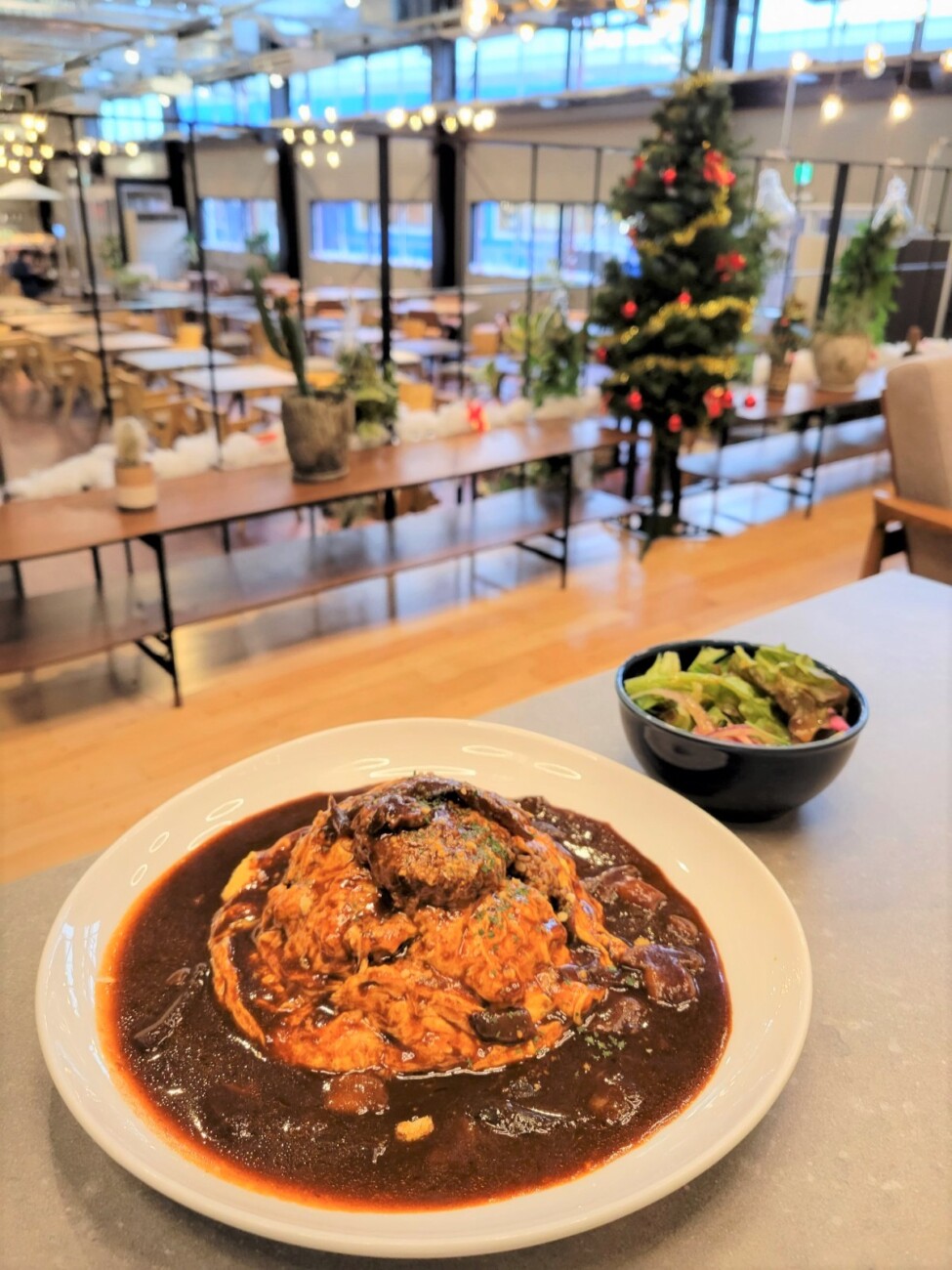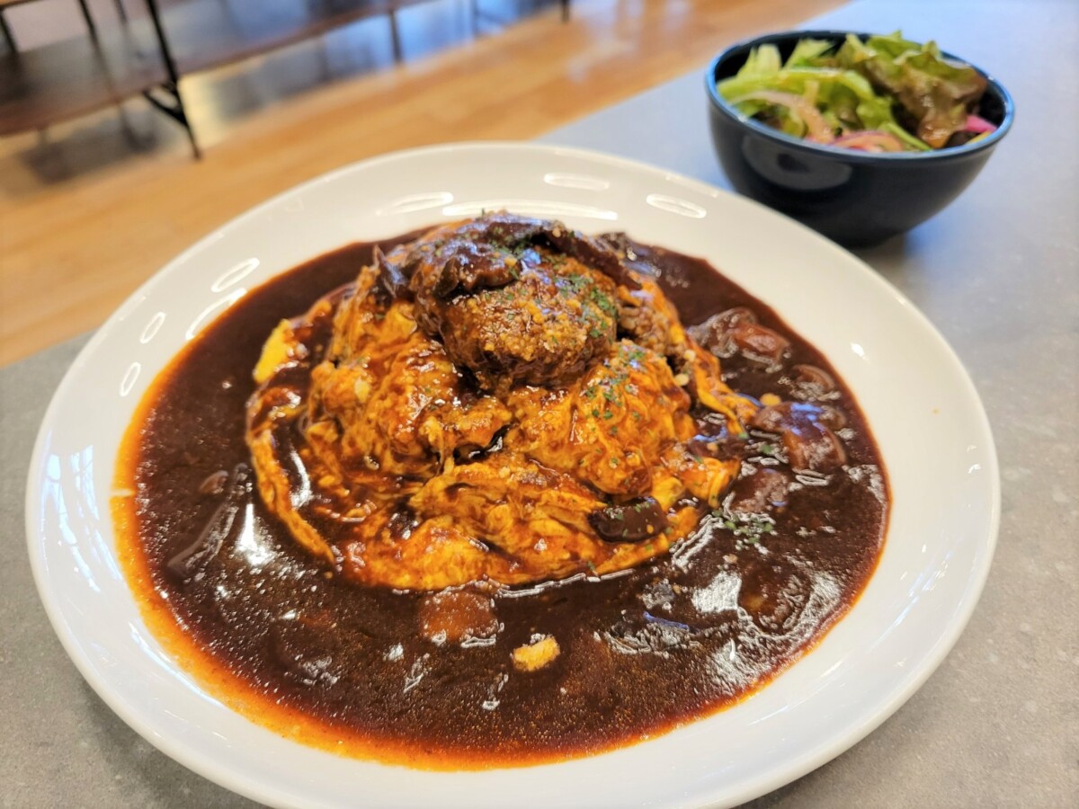 今回は、レストラン「ミヤワカキッチンKOHAKU」の「宮若産地黄卵のオムライス ビーフハンバーグのせ」(ミニサラダ付き1080円)を注文。メニューの名前にもなっている宮若産地黄卵を使用したふわとろのオムライスに、牛肉100%のハンバーグをトッピング、その上から濃厚なデミグラスソースがたっぷりとかかっています。お米も地元で育った、モチモチ感の強い宮若米が使用されています。