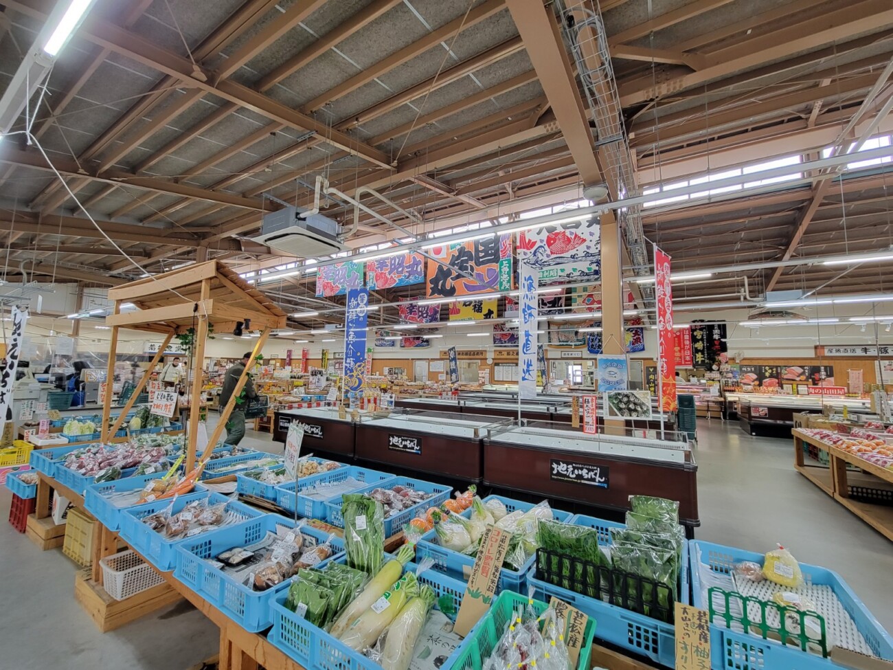 若松・脇之浦漁港から水揚げされたばかりの鮮魚や地元で育てられた野菜や果物、肉、加工品などがズラリと並ぶ大型産直市場「海と大地」。「ふくおかの地魚応援の店」にも登録されています。