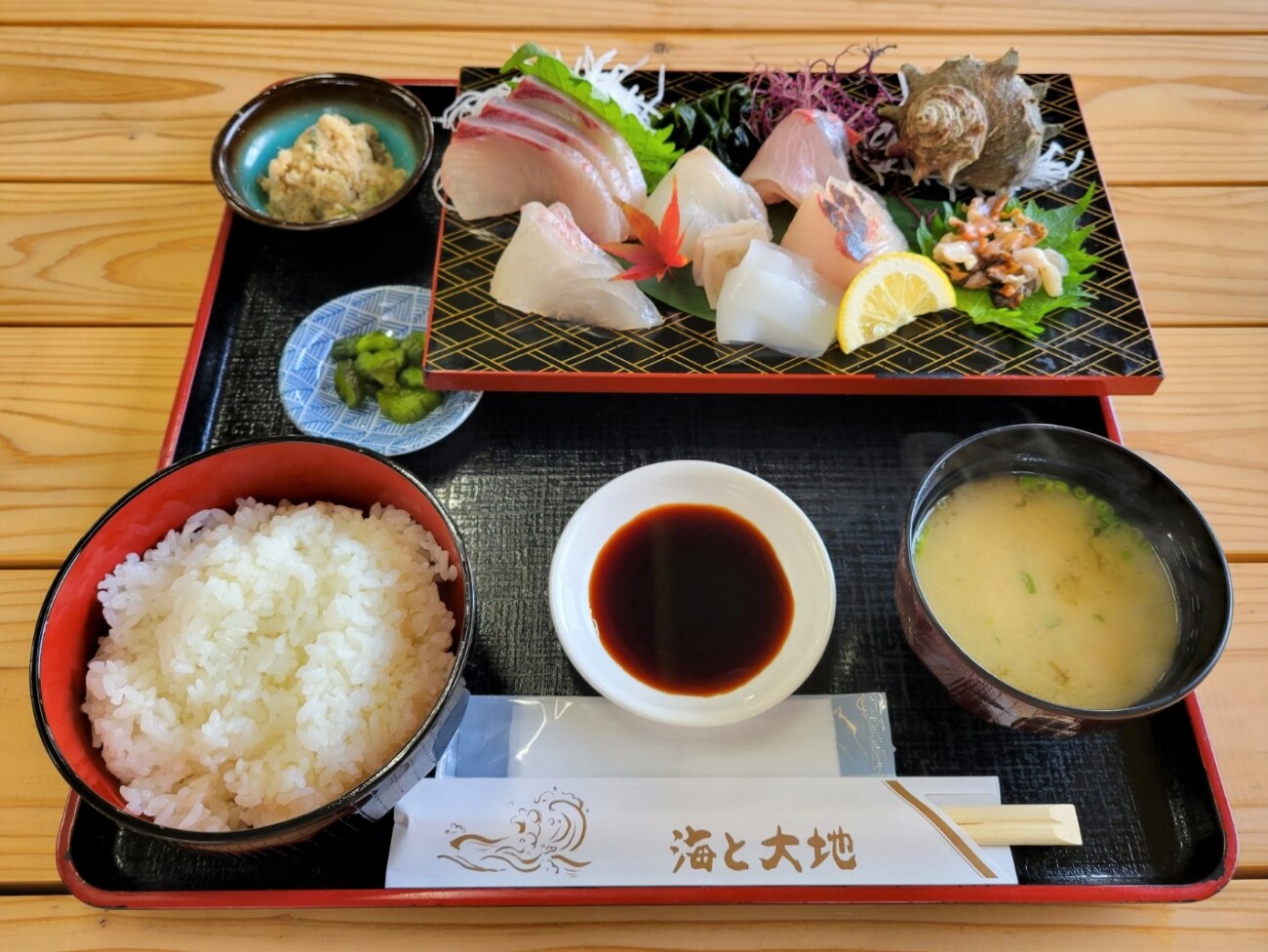 しばらくすると、刺身6点をはじめ、小鉢、味噌汁、ごはん、漬物がセットになった「刺身定食」が目の前に運ばれてきました。タイやカンパチ、イカなど、刺身はどれも新鮮で弾力があり、絶妙な歯ごたえ。噛むほどに魚本来の甘みを感じることができます。