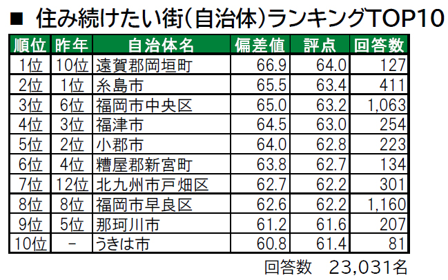 住み続けたい街(自治体)ランキングのトップは遠賀郡岡垣町。