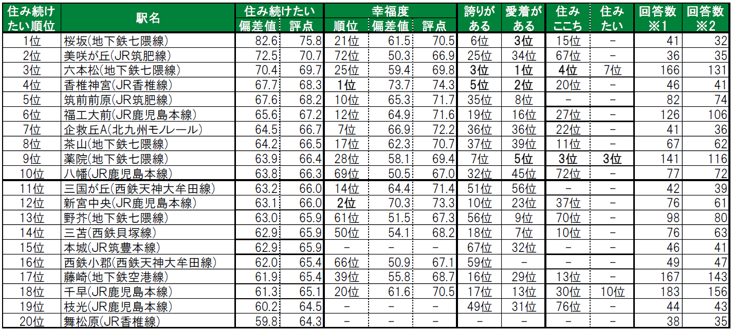 住み続けたい街(駅)ランキングのトップは「桜坂」(地下鉄七隈線)。北九州市からは北九州モノレール「企救丘A」(※企救丘・志井公園)が第7位にランクインしました。